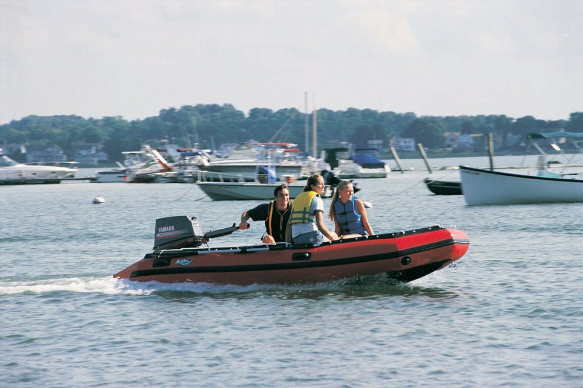 Achilles SG-156 inflatable boat is the largest model of the SG sport utility boats. Durable features include hypalon fabric with extra-large 20" tube chambers, full length splash guard with life lines, and a rigid deck system. Typical applications include commercial & rescue operations, diving, fishing, ocean play, and people moving. The boat can plane with six to eight persons and the use of a 50 horsepower outboard, with max capacity being 8 persons or 1,270kgs.