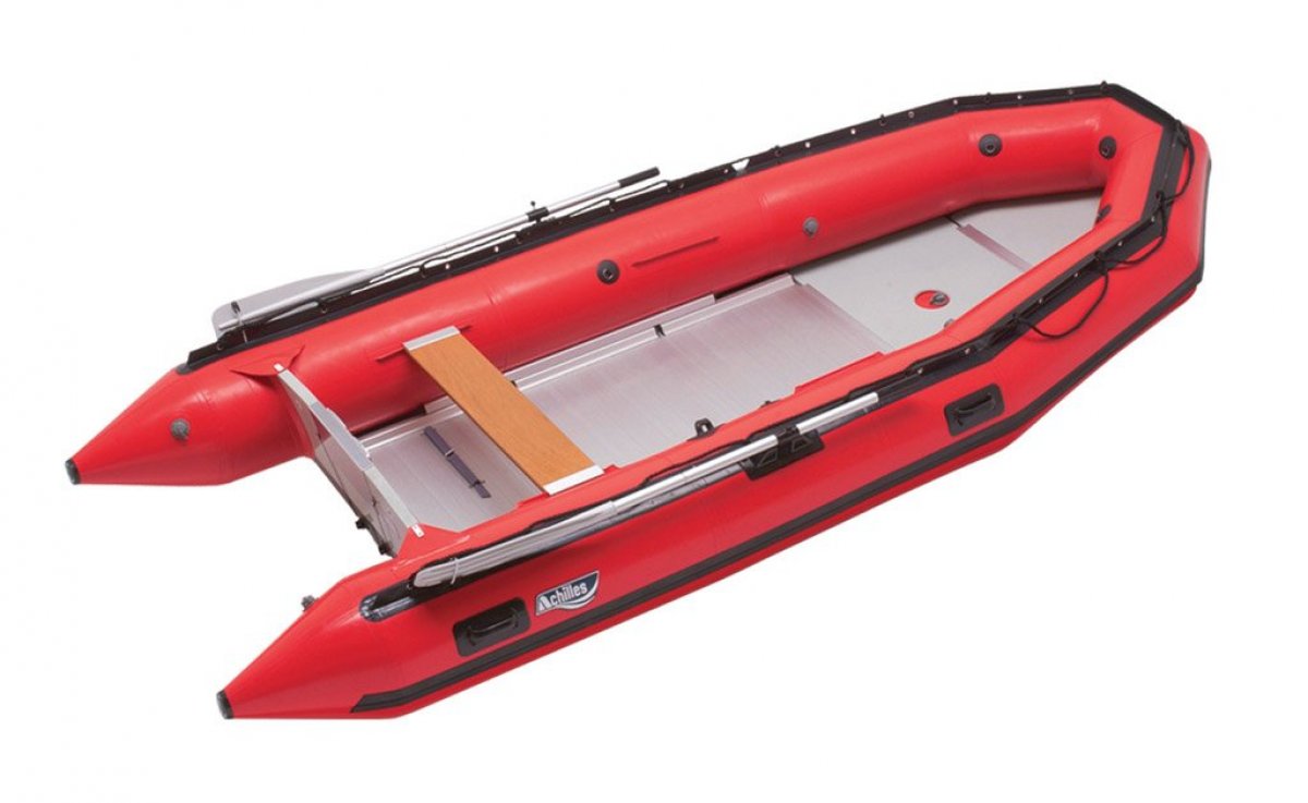 Achilles hypalon reinforced fabric, aluminum and fiberglass (aluminum and wood in SG-124) floorboards with aluminum stringer system, full length rub strake, air keel, fuel tank tie downs, (2) bailer valves, fold down locking oar system and oar holders (except SG-156), bow carry handle, lift and carry handles, towing bridle D-rings, helmsman grip, full length splash guard with life lines, removable wood seat (except SG-156), extra seat attachment patches, large high volume foot pump, double carry bag system, and maintenance kit