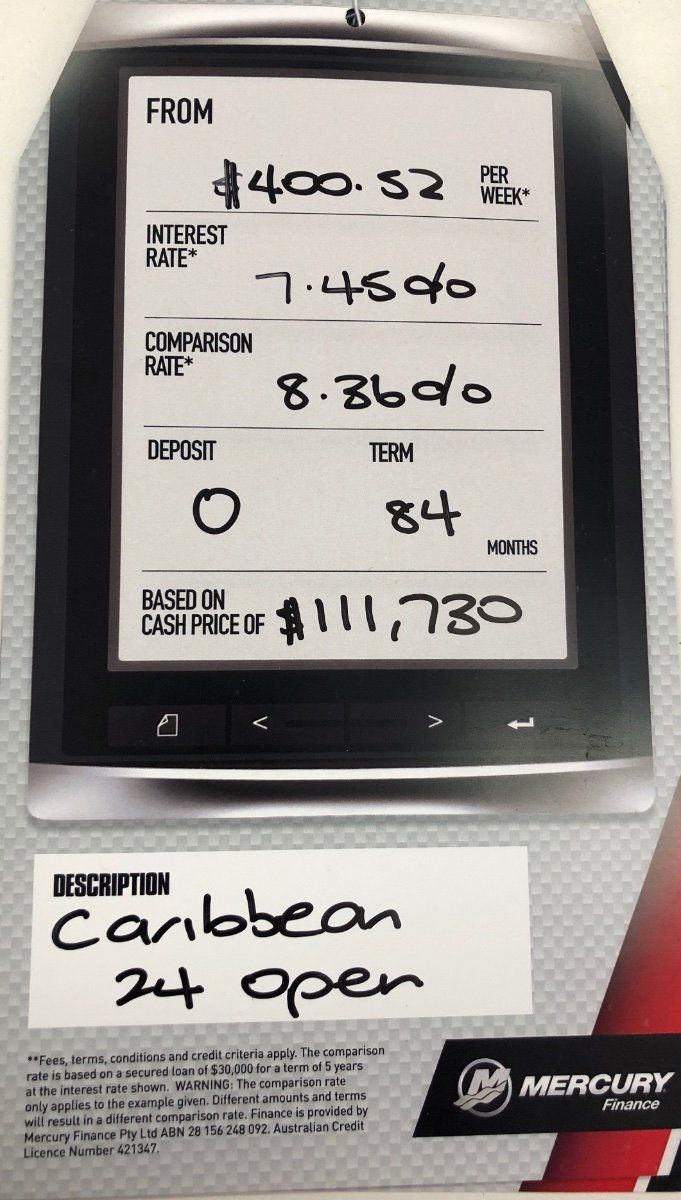 "The Caribbean 24 Open proved willing, jumping out of the blocks to a top speed of 33kts, clocking a fast cruise of 24.5kts, and holding a smooth family cruise of 21kts for 35lt/h. More importantly, the deep-vee hull makes a whoosh rather than a slam crossing the swells. If the wind and boat wake pipes up on Sunday afternoon, no worries, the Caribbean 24 Open will leave all that trouble floundering behind it. "