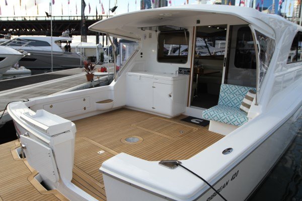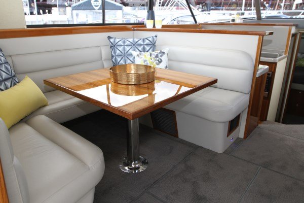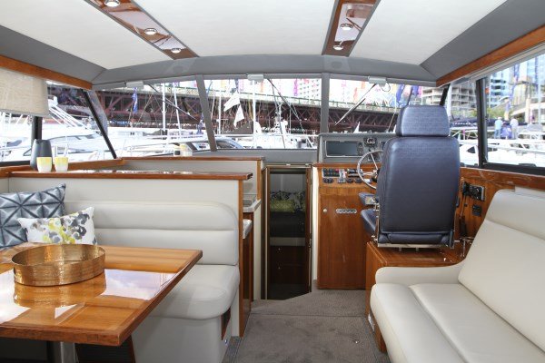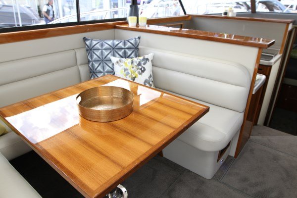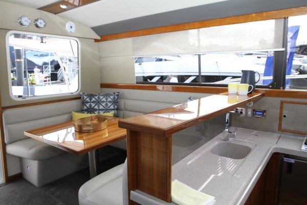 The rear bulkhead houses a big opening window on the Port side, with the sliding door opening to the Stbd side, this opens the whole back of the boat up, for visual purposes and social interaction.