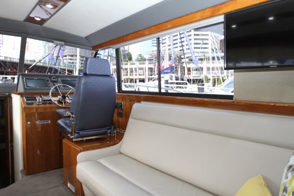 There are 2 x saloon layouts offered within the C40 Express. One with a STBD couch that converts to 3 x berths as per the Flybridge model, and a new offering with a long entertainment cabinet to STBD with a large pop up TV. Naturally with the inclusion of the lower helm in the C40 Express, the layout has been restructured, but the open feel and vision from the helm is spot on, whilst sitting in the leather clad luxury helm chair.
