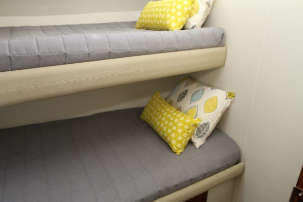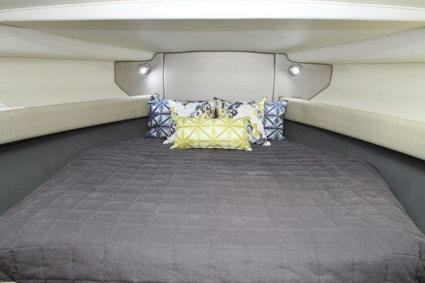 Large FWD cabin with queen sze bed. Under bed storage, hanging locker and large side storage pockets.
