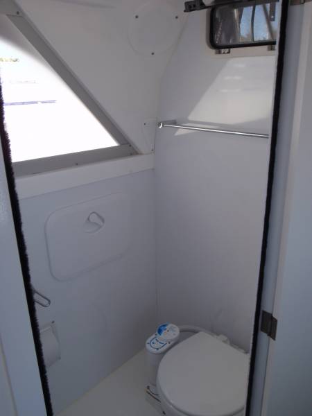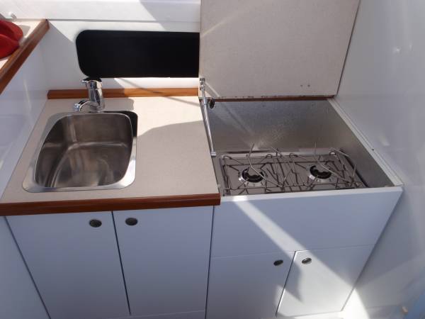 The galley has heaps of storage, a st steel sink and a spirit stove cooker, whilst the large ICE chest on the port side will keep your goodies cold. We can also convert the ice chest to a fridge if required, or there is plenty of deck space to add an Engel or similar.