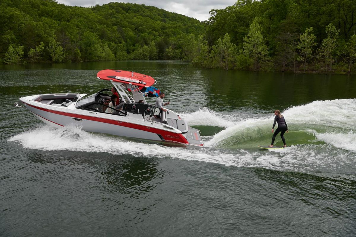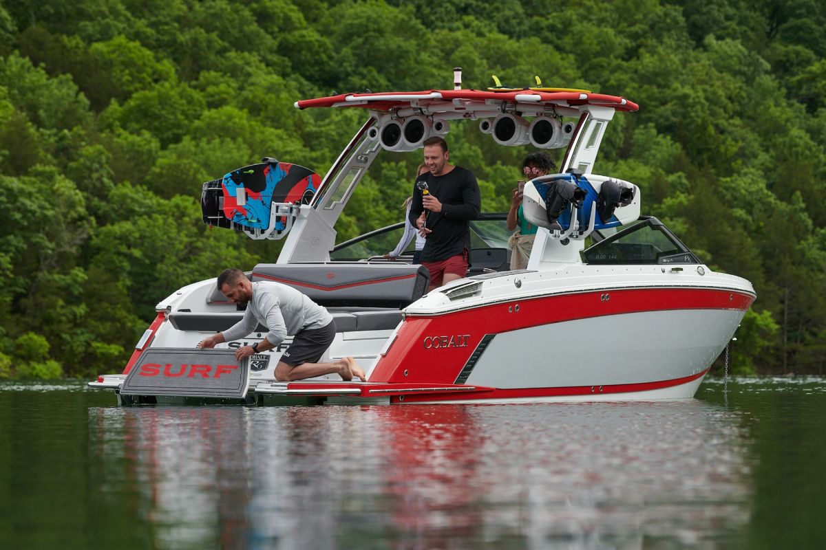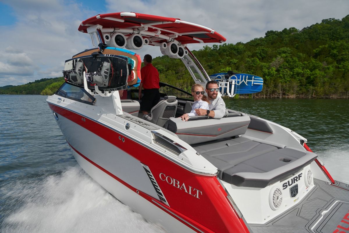 Cobalt's Surf Series seamlessly integrates Surf Gate(TM) with a custom-designed surf hull, all powered by Volvo Penta. Nearly all boats in the series employ traditional hard ballast tanks for wave customization. The R33 Surf adopts a streamlined design without ballast tanks. This tailored approach ensures agility and simplicity, redefining expectations for surfing enthusiasts across the entire Surf Series.