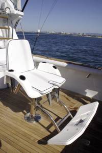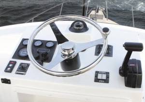 We have designed the bridge around the skip with a comfortable high quality helm chair, ergonomically designed instrument and control station which allows mounting of the sounder, GPS, autopilot, radar, and radios all at your fingertips. Simple lever controls are mounted on raised pods to enable the skipper to stand facing the cockpit when the "fight is on".