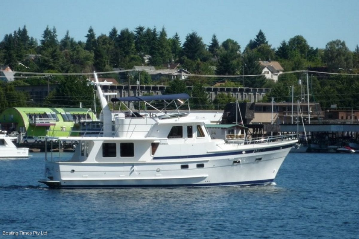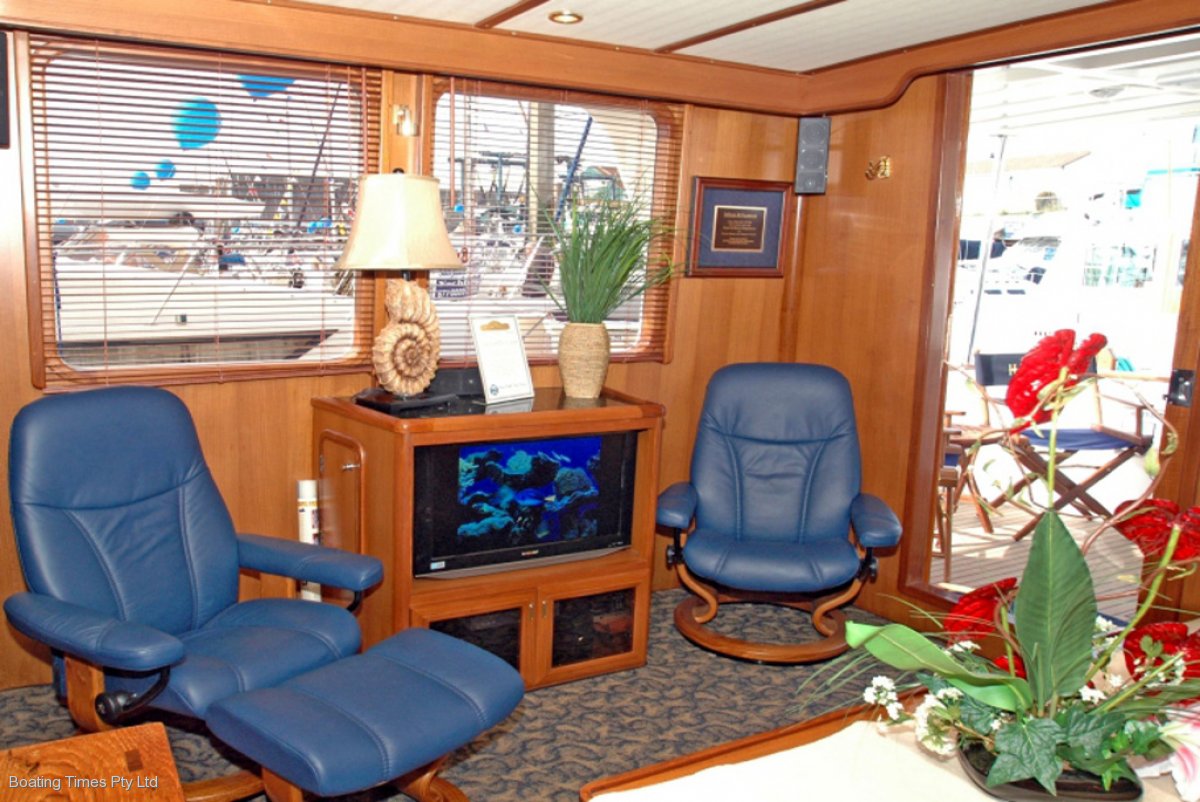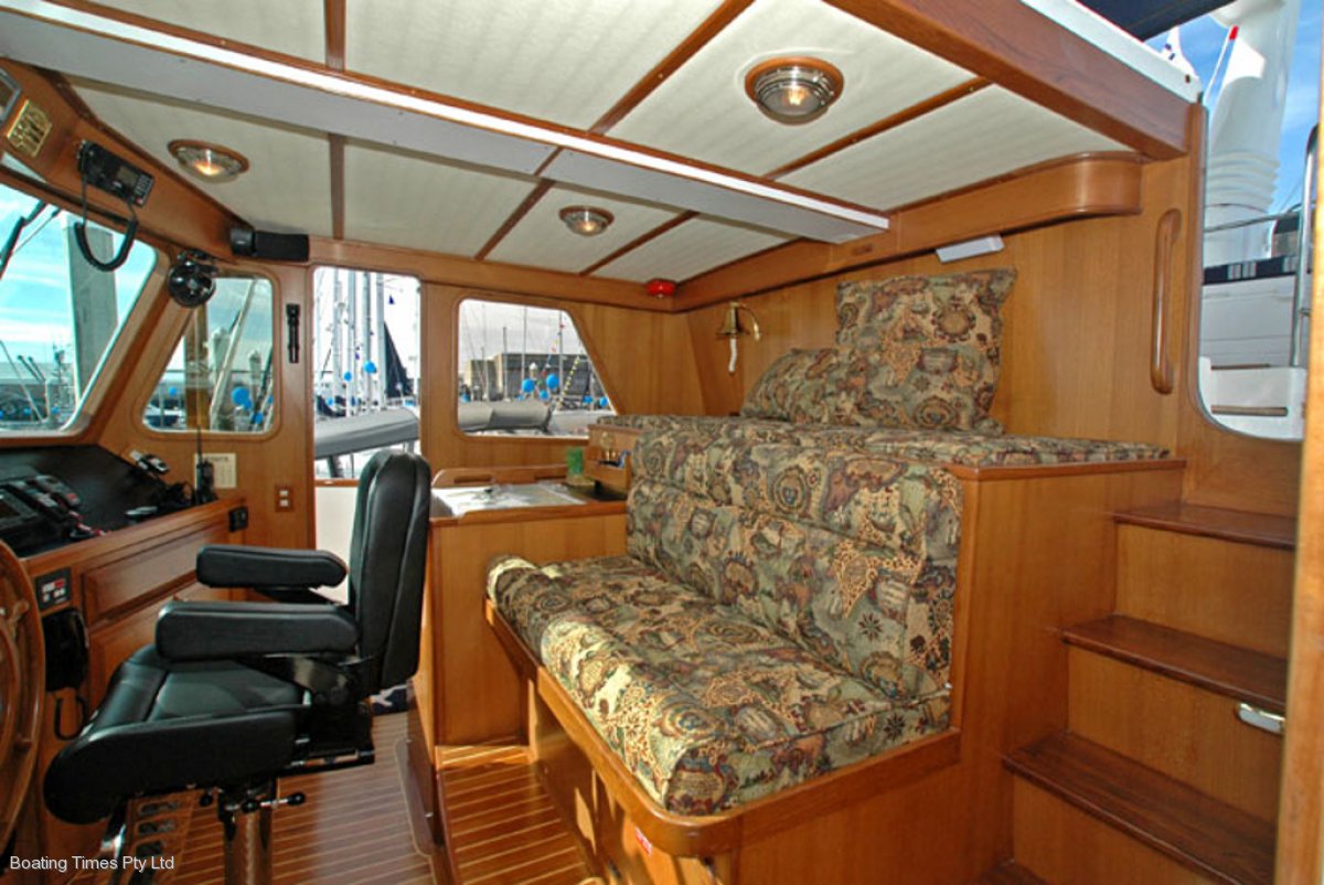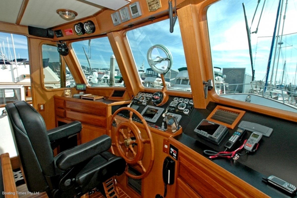 The hand-laid fibreglass hull, gelcoat finish, has a full-length keel to protect the massive underwater running gear.