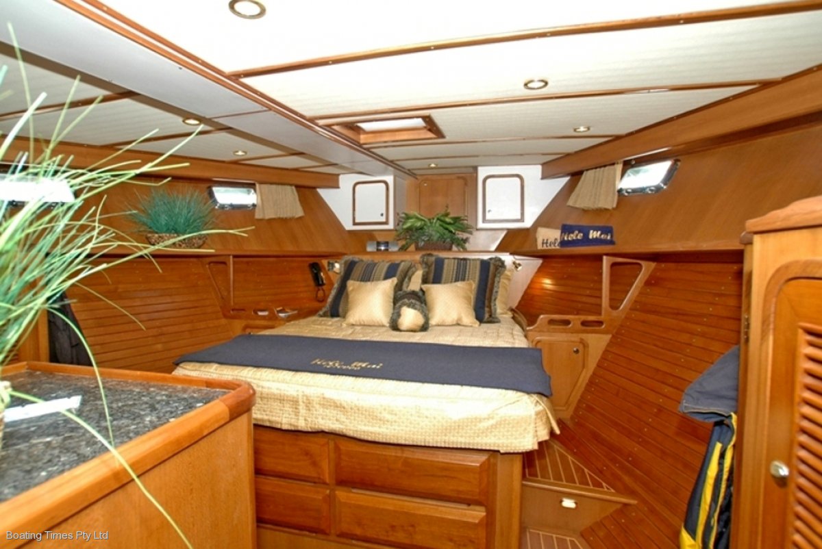 On the DeFever 46 you will find moulded-in non-skid decks for safety underfoot, along with stainless steel stanchions, FRP swim platform with boarding and swim ladder and quality stainless hardware such as chocks, cleats and port lights with screens.