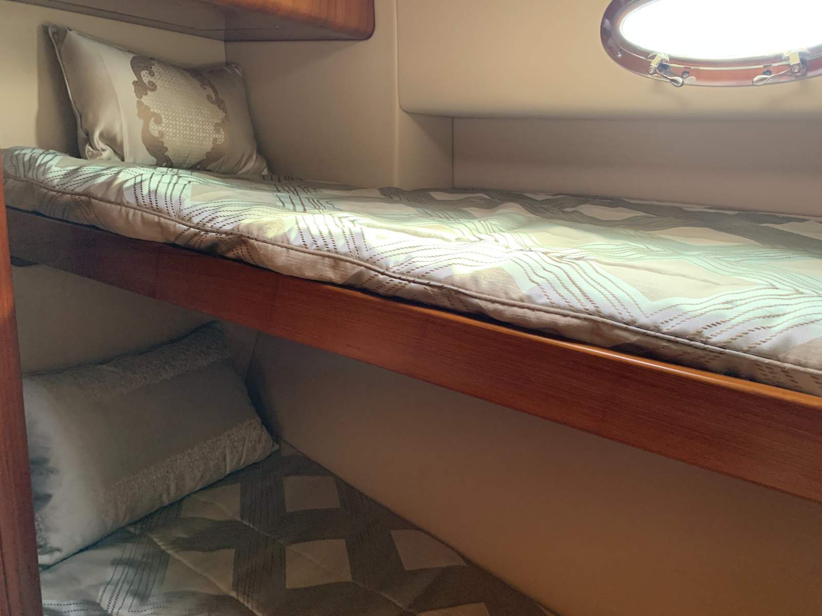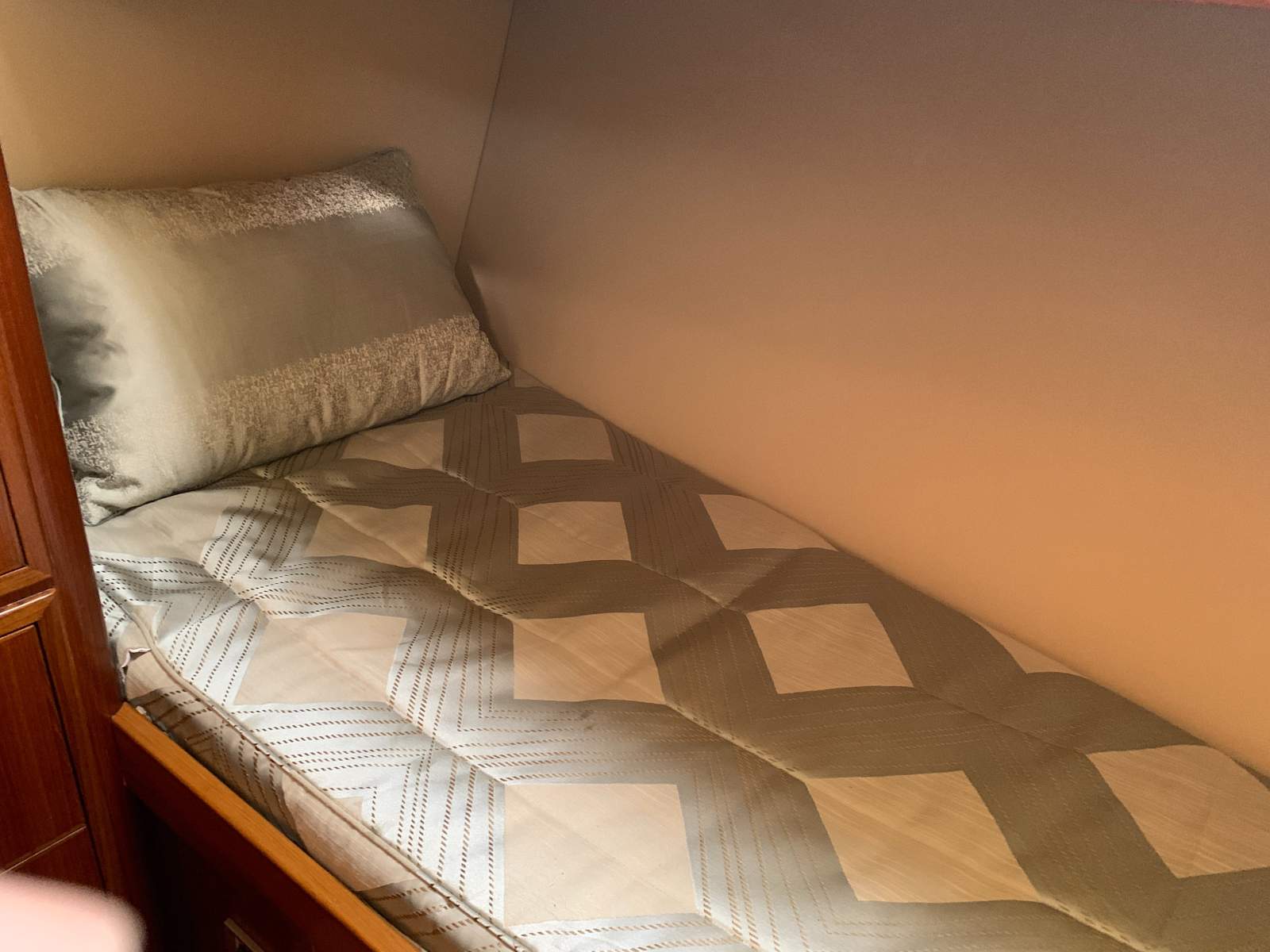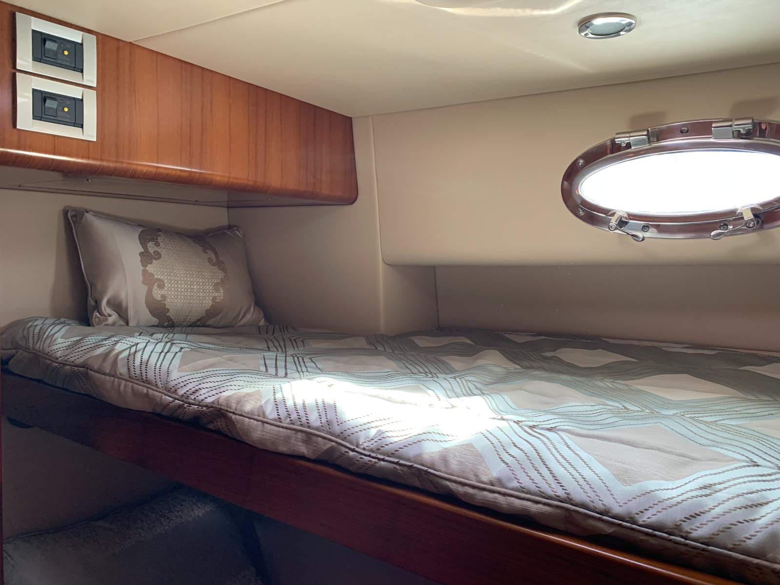 The spacious forward stateroom features a queen island bed and ample storage, offering a luxurious retreat for owners. The guest cabin, located on the port side, includes two large single bunks--perfect for accommodating family or friends.