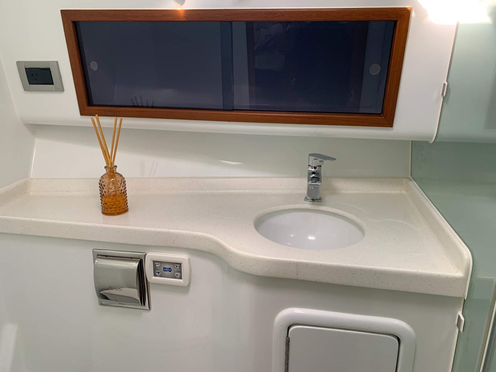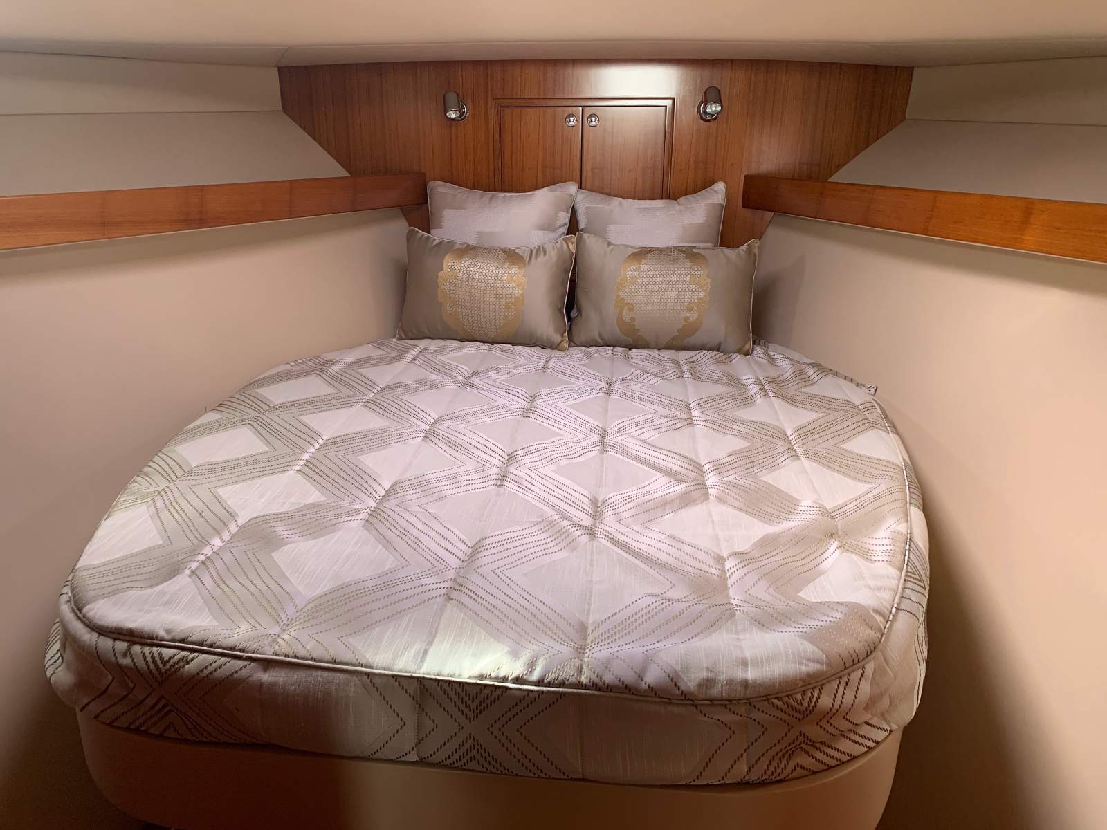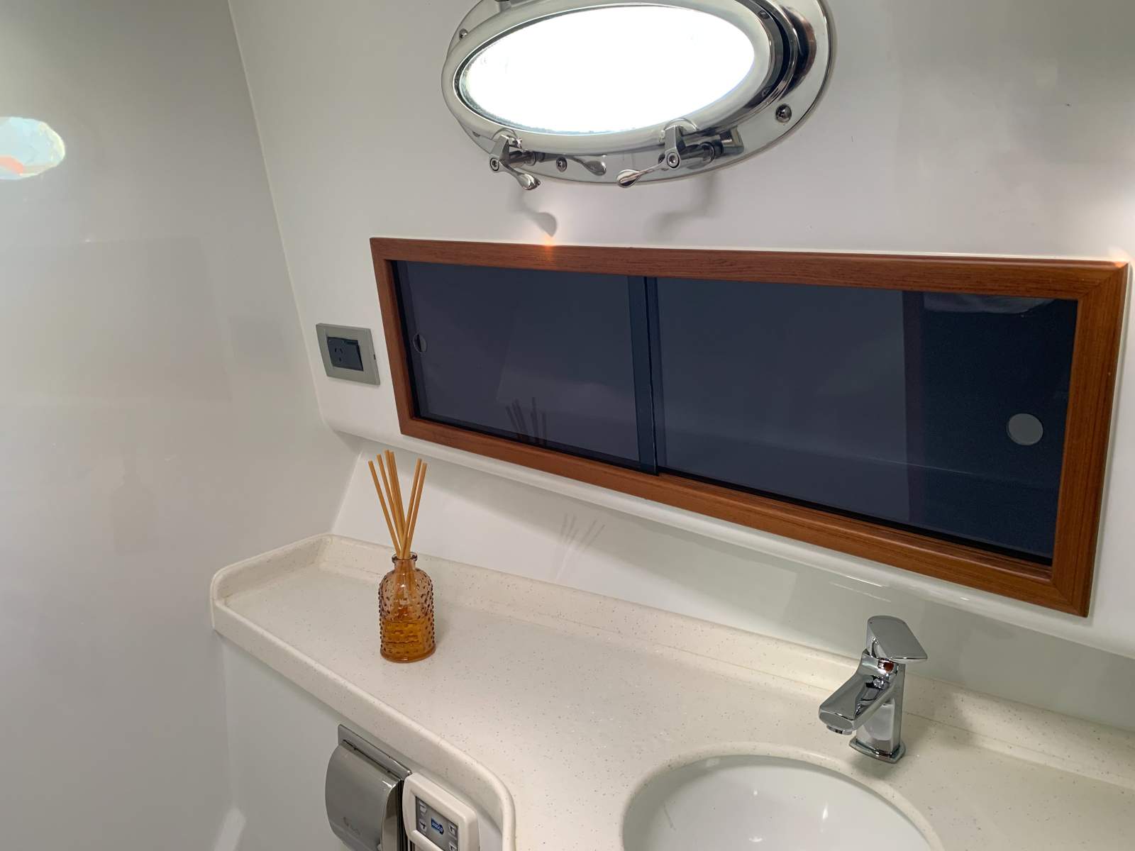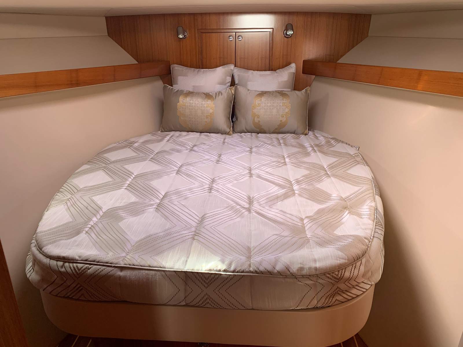 The spacious forward stateroom features a queen island bed and ample storage, offering a luxurious retreat for owners. The guest cabin, located on the port side, includes two large single bunks--perfect for accommodating family or friends.