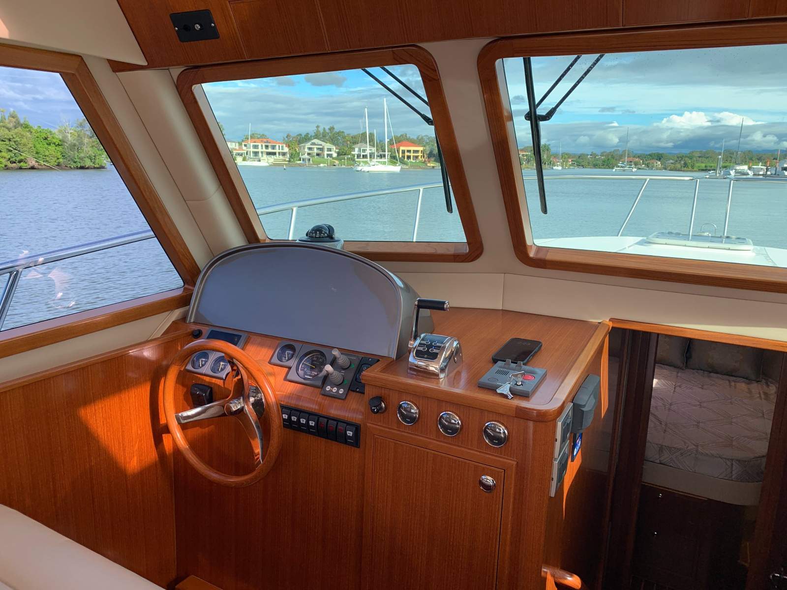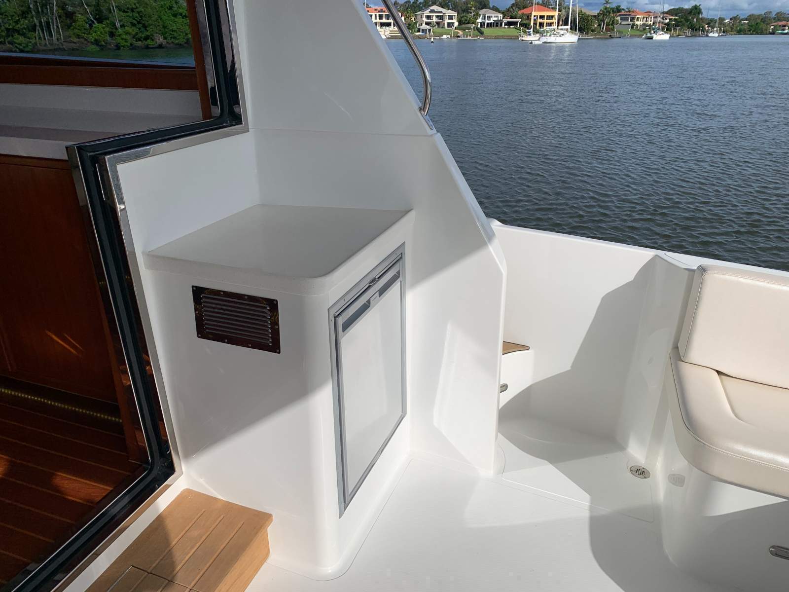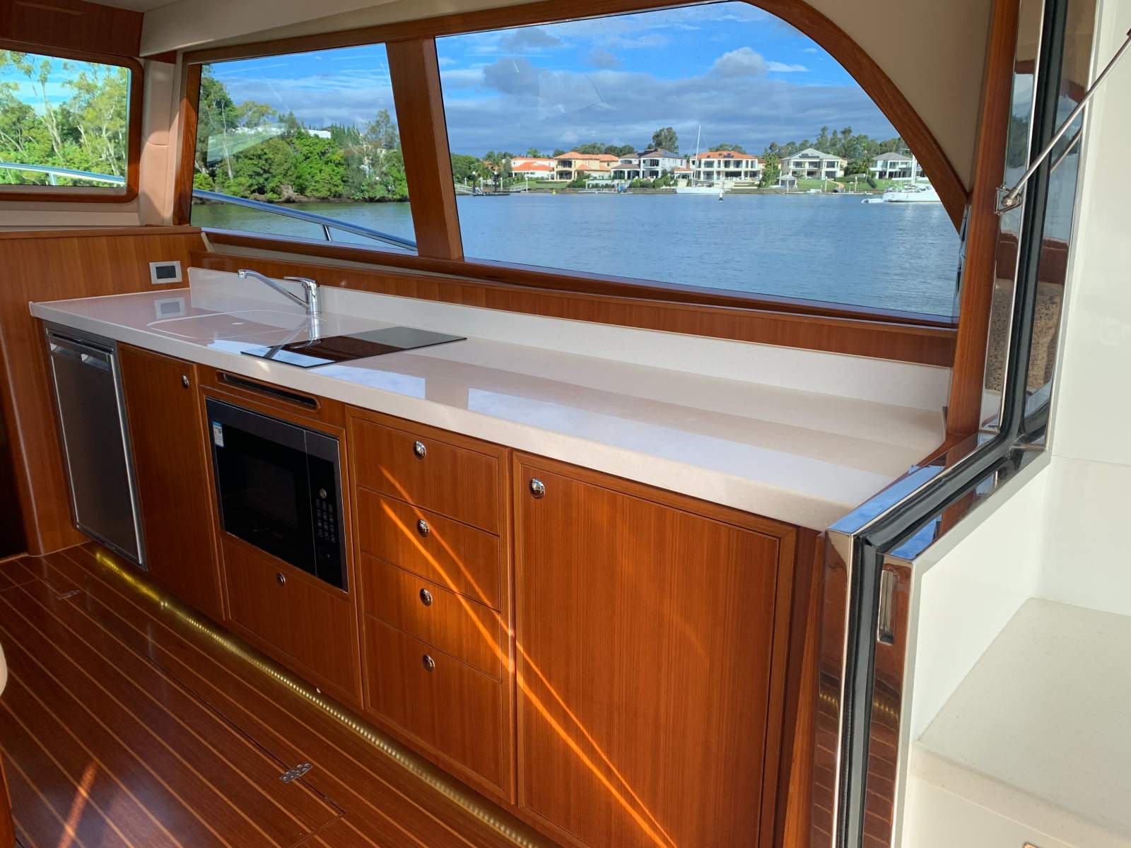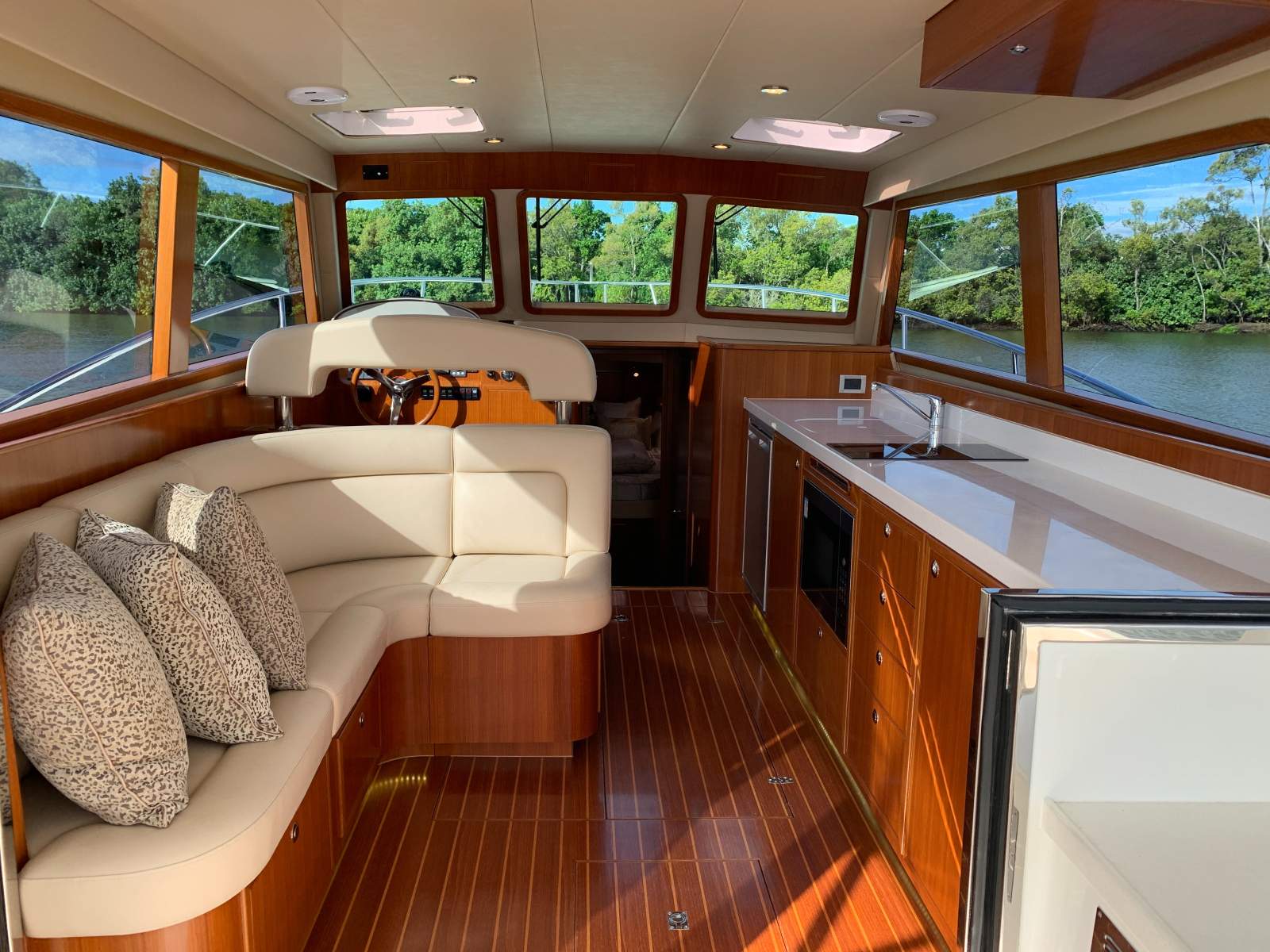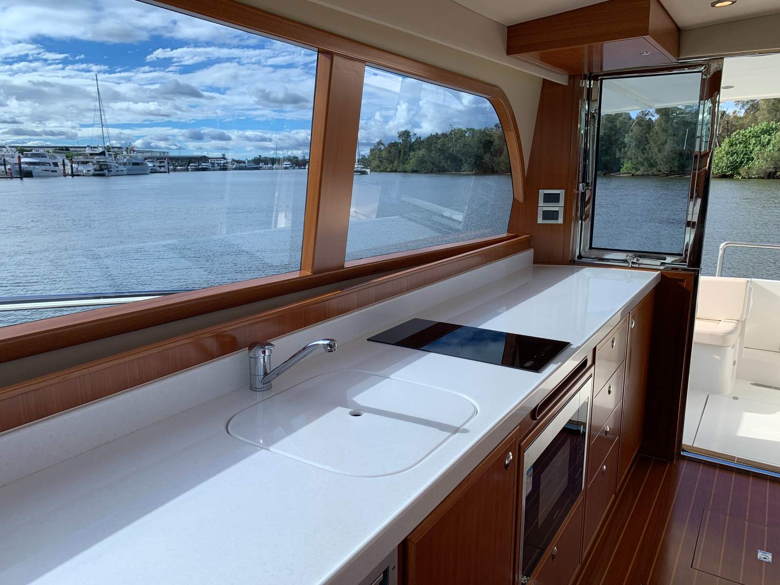 In the saloon, the helm is positioned to port, while the starboard side houses a well-appointed galley with electric hot plates, a Waeco fridge / freezer unit, under-bench microwave, and generous storage for extended trips.