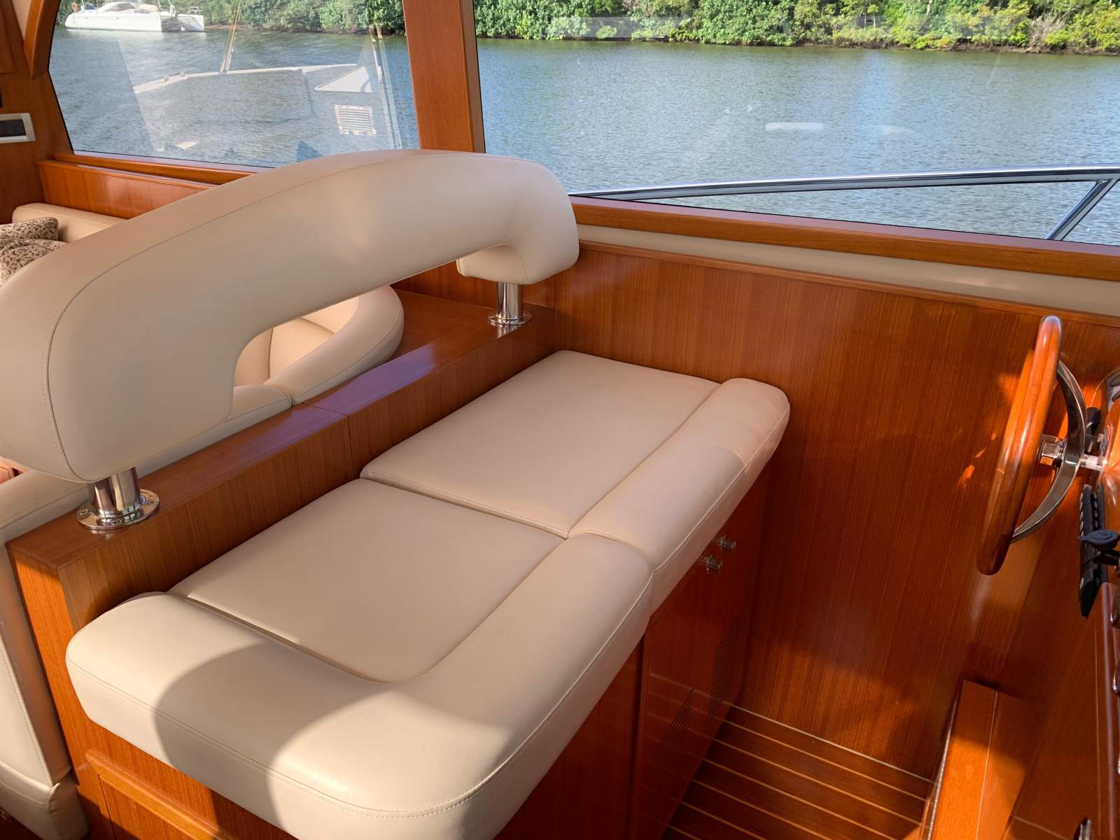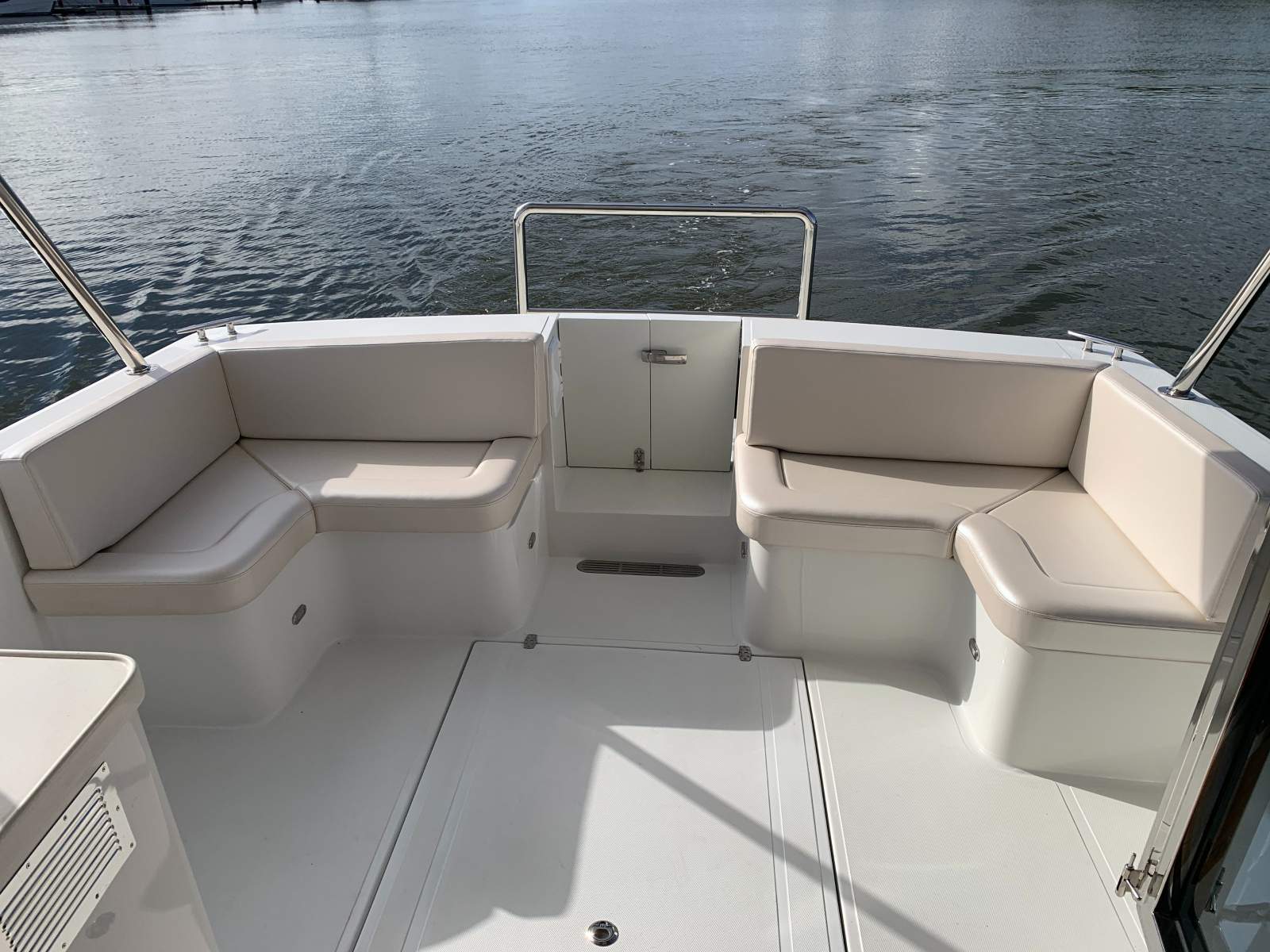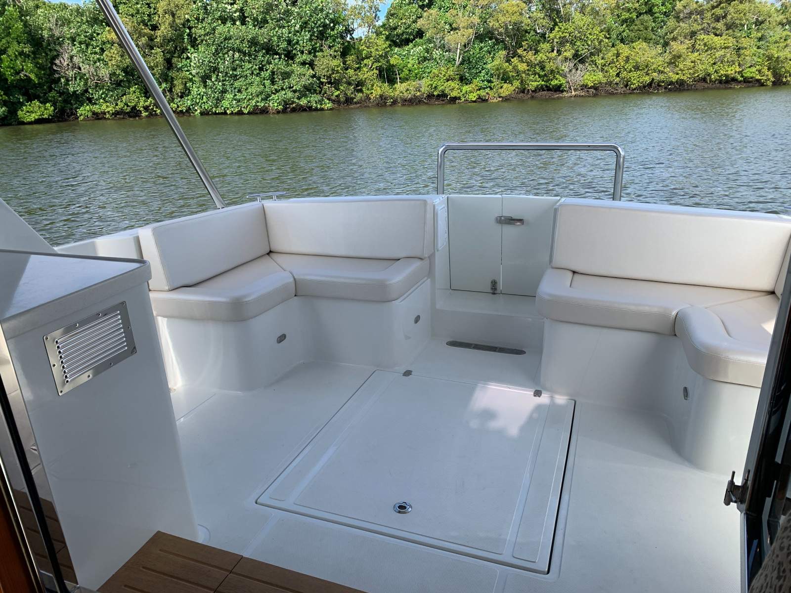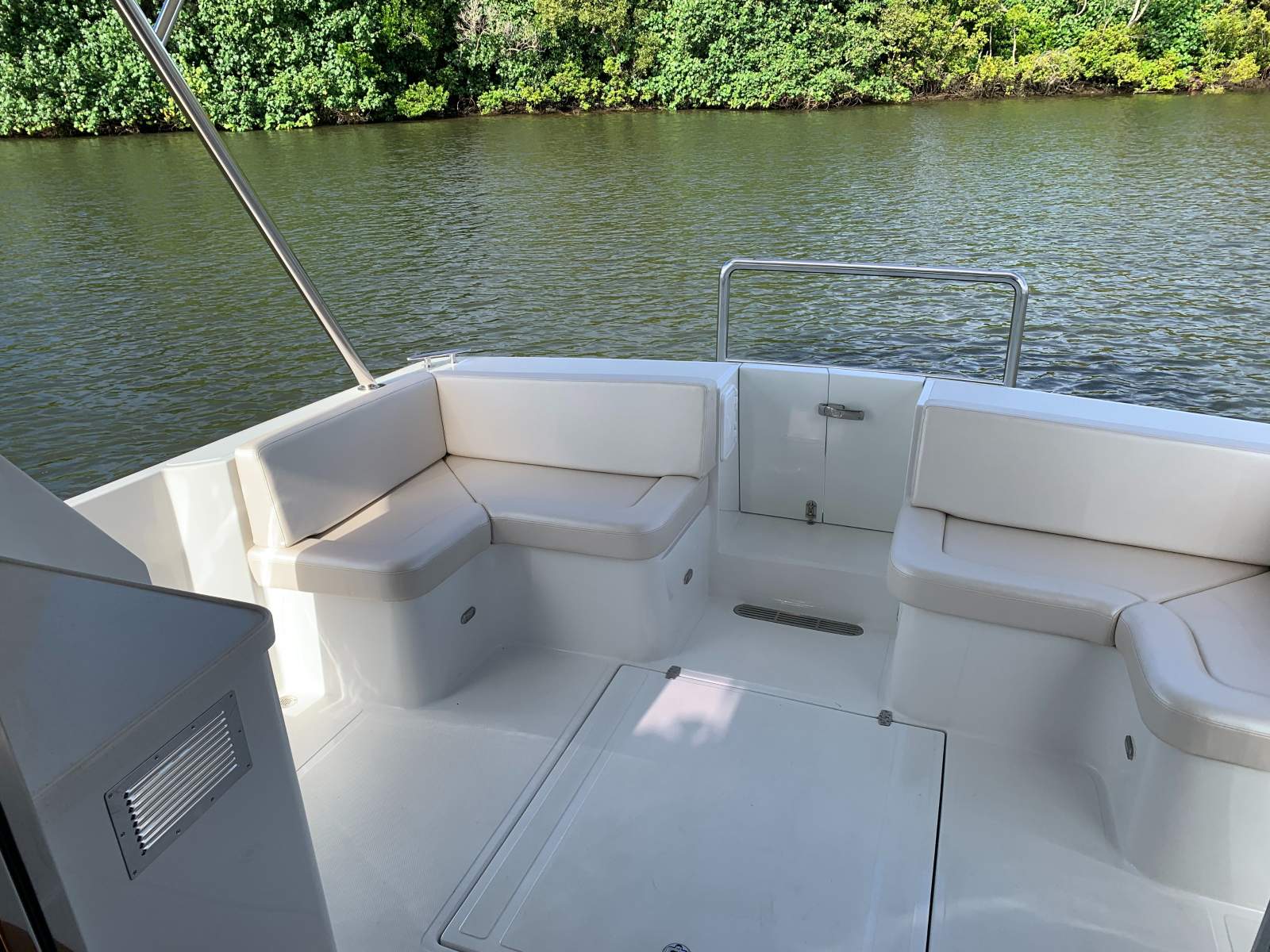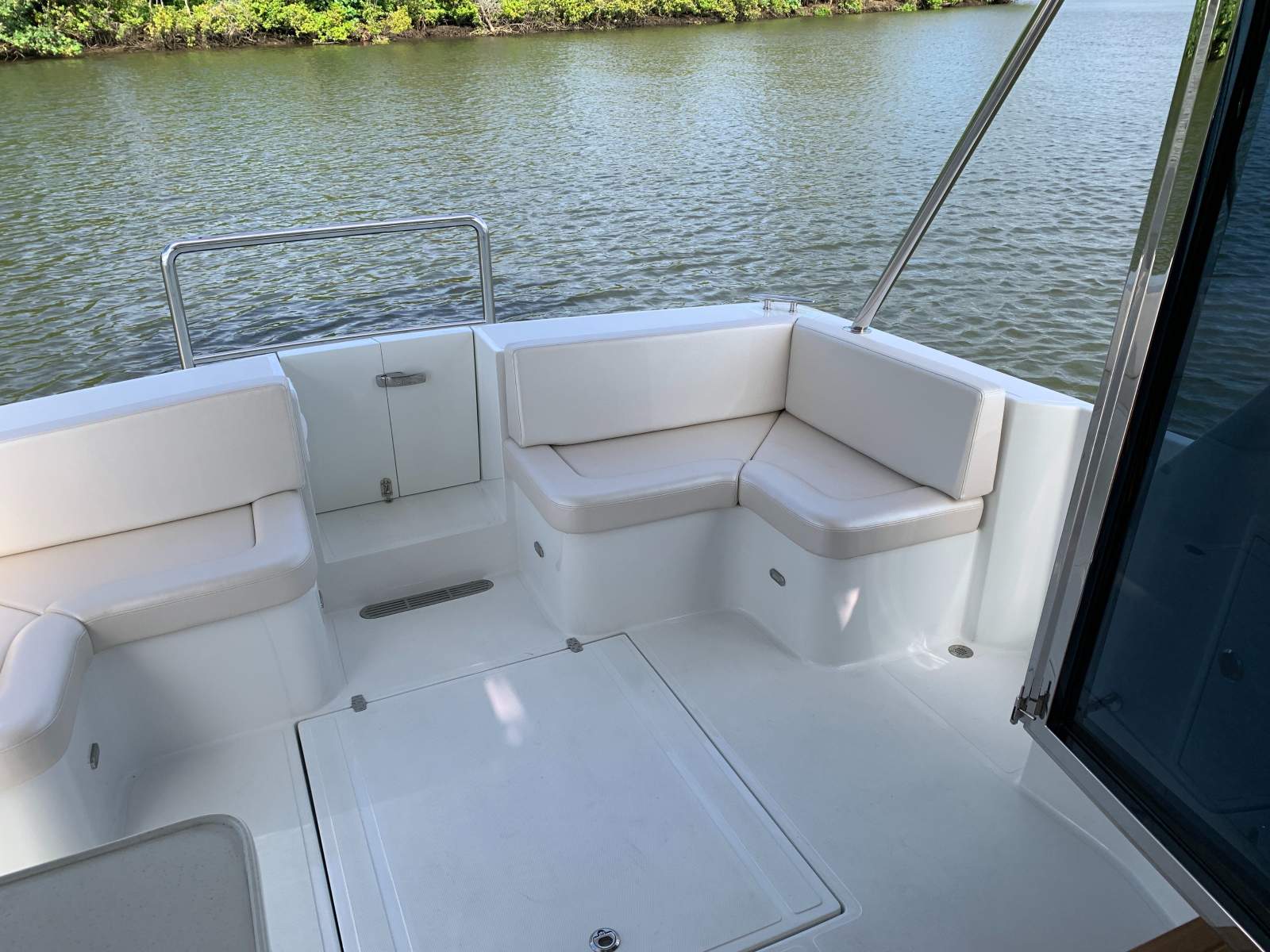 The cockpit includes built-in seating in both aft corners for alfresco dining and socializing and is covered by the extended hardtop.