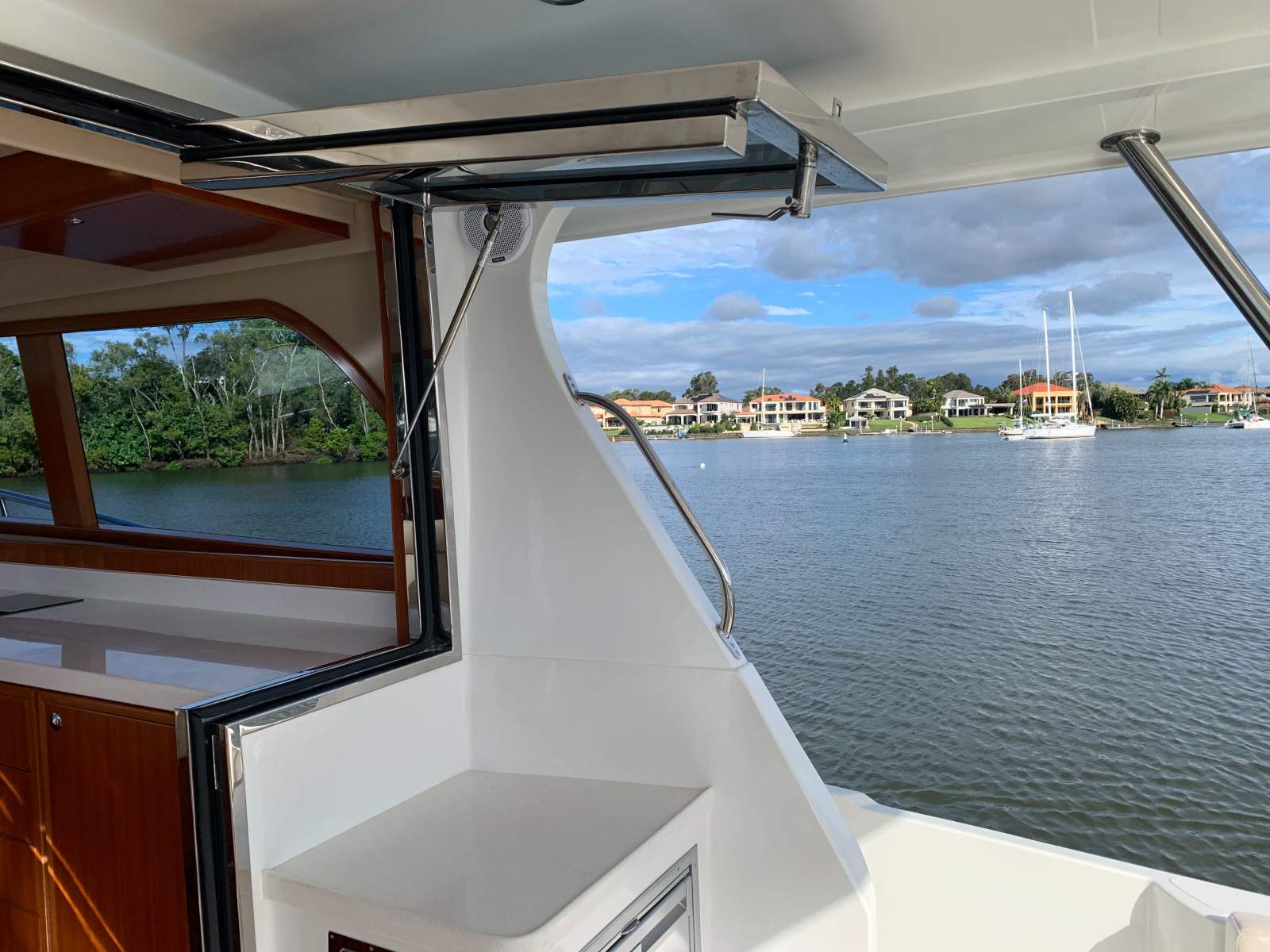 A large L-shaped lounge is located to port in the saloon, providing a comfortable spot for relaxation. One of the standout features is the stainless-steel sliding doors that span the width of the rear cockpit, complemented by a hopper window on the starboard side.