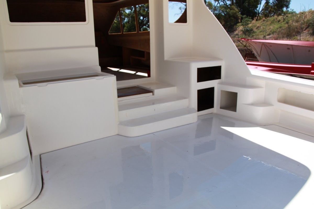 The fibreglass hull construction utilizes the latest technology with vinyl ester skincoat and stitched multi axial re-enforced fabric with PVC foam core on hull sides, superstructure and flybridge. Foredecks include aluminium composite panelling with re-enforced glass.