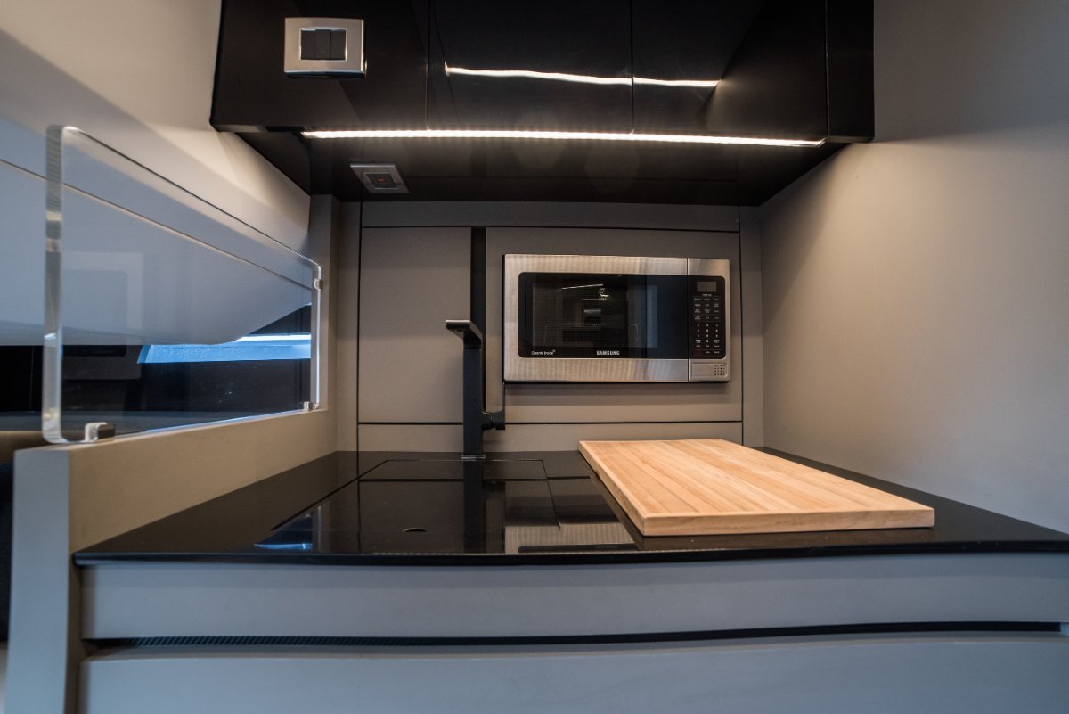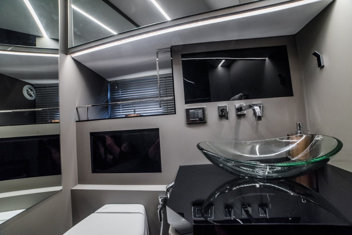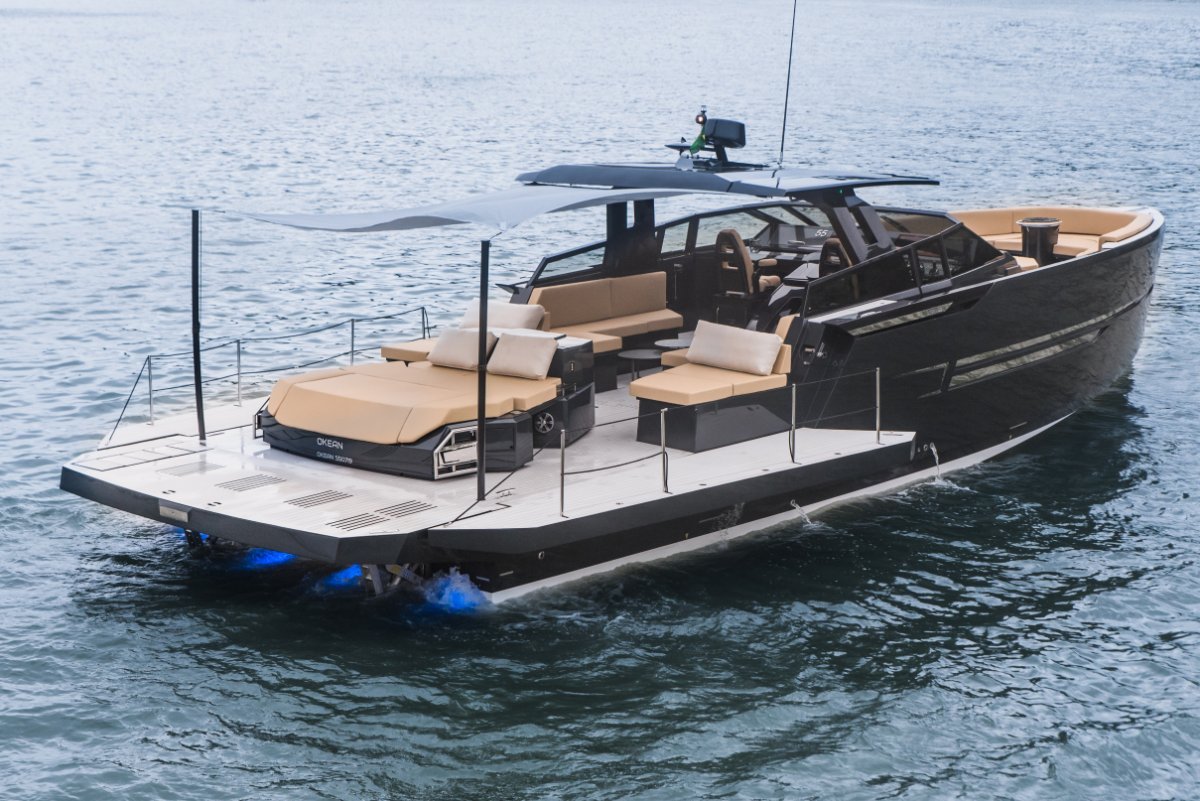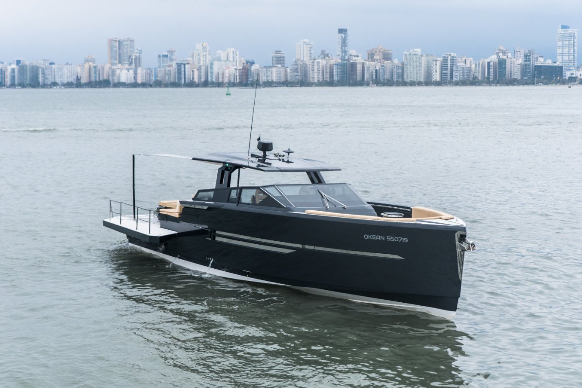 The Okean 57 combines modern aesthetics with technology. Its w-shape allows navigation that resembles the active suspension of Formula 1, combining speed and comfort. With 5 meters of mouth, its straight prow has an area where it is possible to create a living environment with sofas, or leave it totally enclosed with a large solarium.
