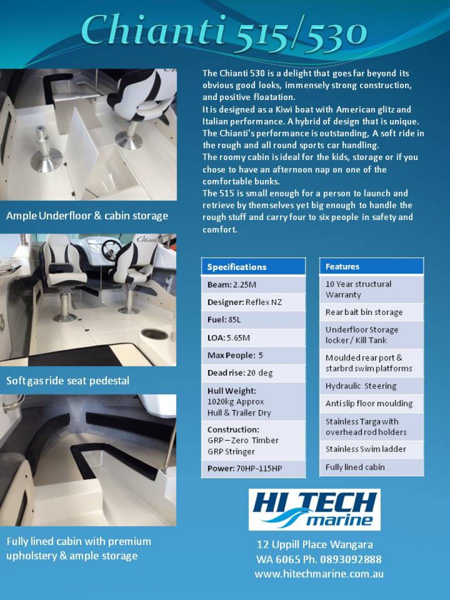 The Chianti 530 is a delight that goes far beyond obvious good looks, immensely strong construction, and positive floatation. It is designed as a Kiwi boat with American glitz and Italian performance. A hybrid of design that is unique.