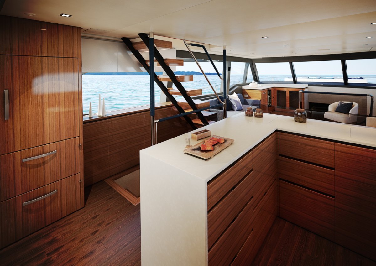 The main saloon may include dining and lounge spaces or simply act as the grand lounge with dining focused on the aft deck which can be semi-enclosed, covered entirely by the bridge deck overhang and protected by optional clears. The large U-shape galley, with twin ovens, four-burner hob, comprehensive refrigeration and storage capabilities, has been positioned as a centrepiece of the entertaining spaces.