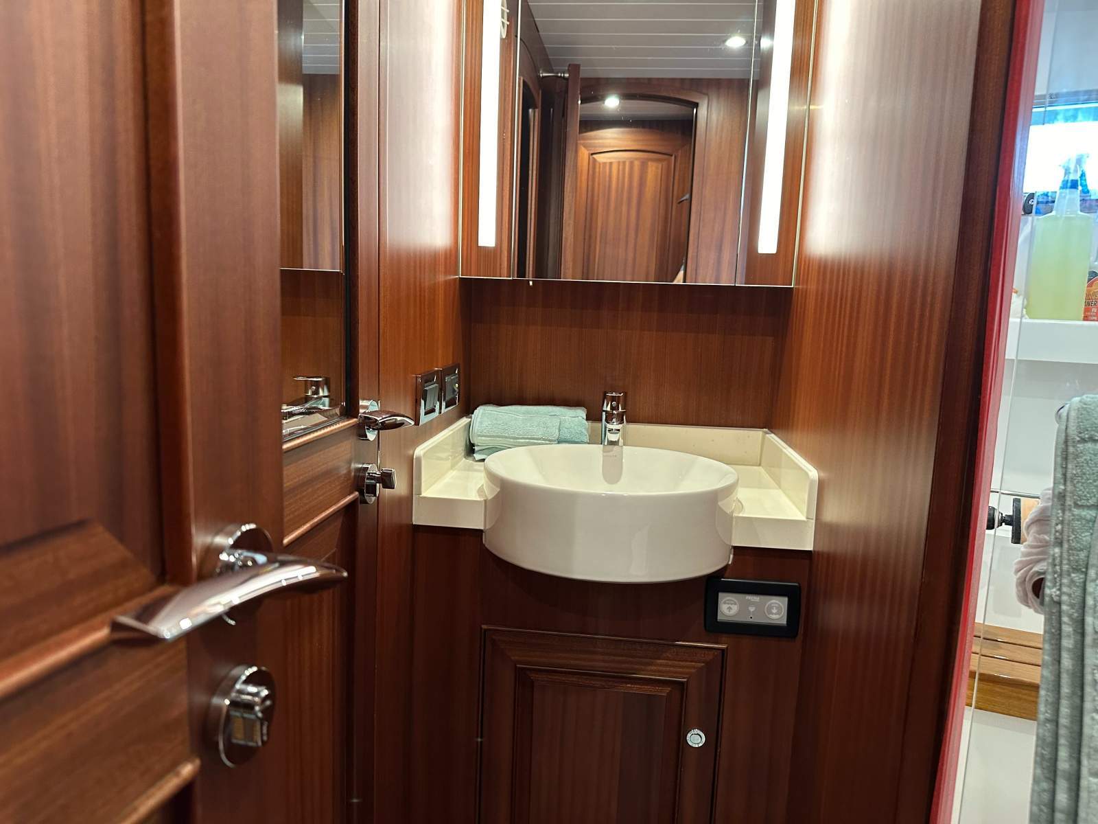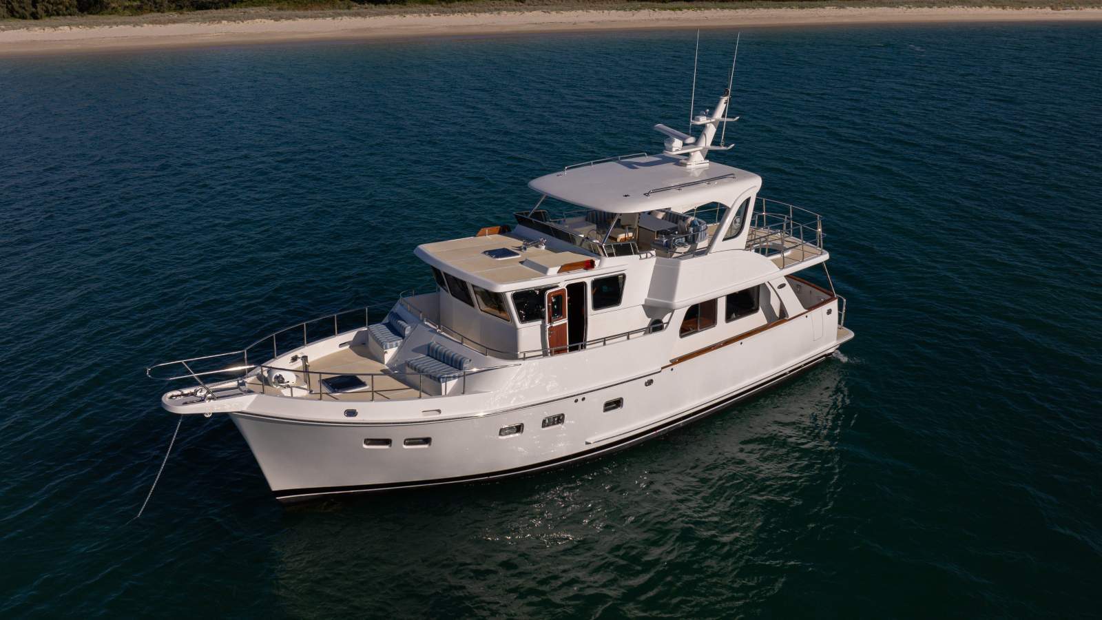 The saloon can be finished in teak, oak or mahogany. The U-shaped galley forward features Corian countertops and modern appliances, including a full-size refrigerator with a freezer.