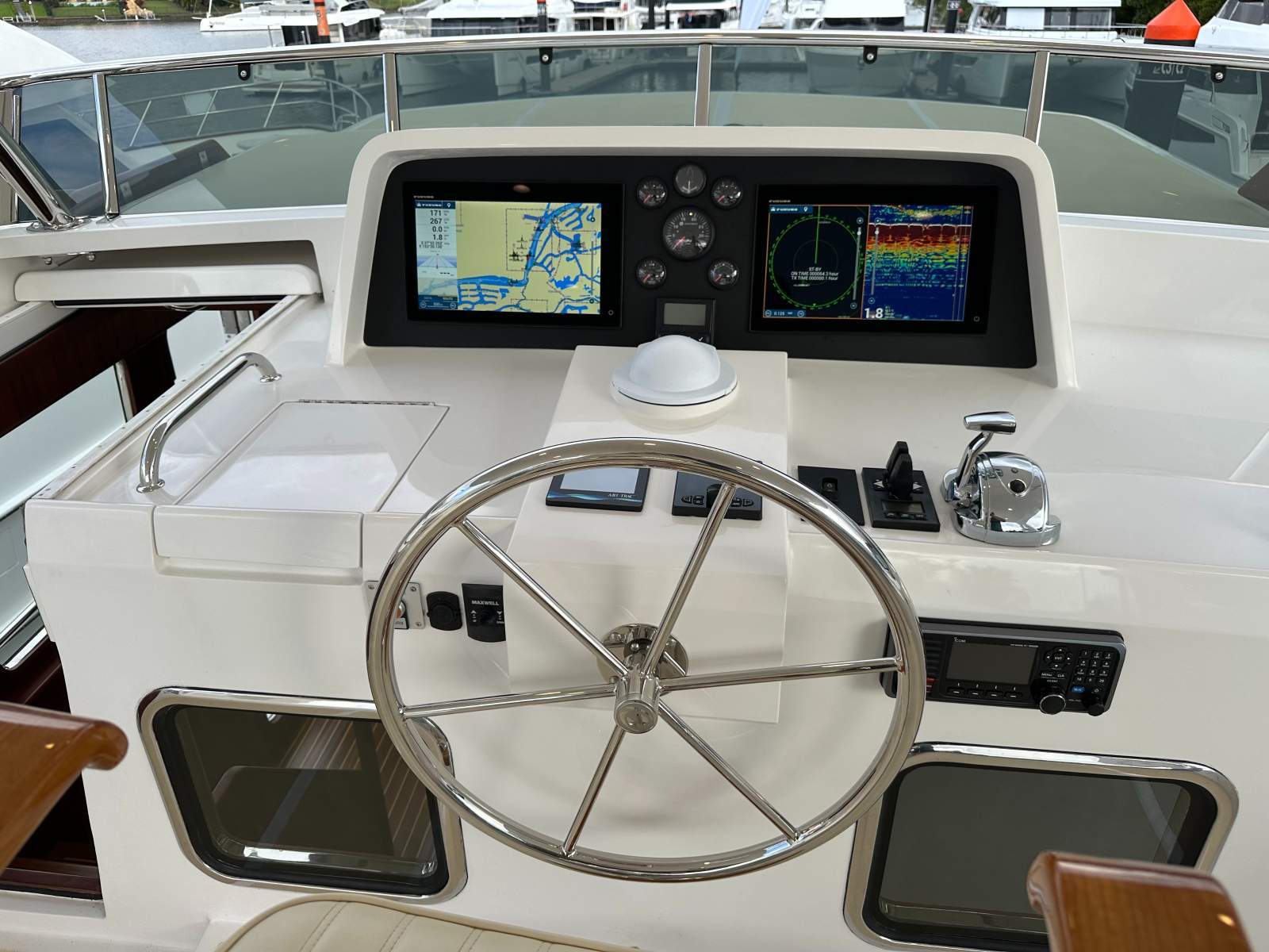 Furuno touch screen x 2 in wheelhouse and on the flybridge for the radar, GPS and sounder plus Furuno autopilot and Icom VHF x 2 with AIS