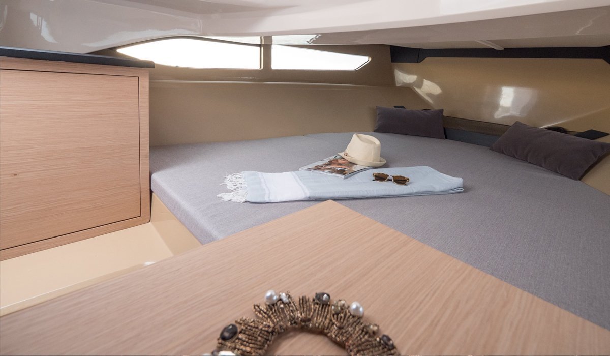 Oak inside cabin and floor - porte-hole - double bed with storages underneath and table arrangement - electric marine wc storage - furniture with refrigerator storage - objects holder net.