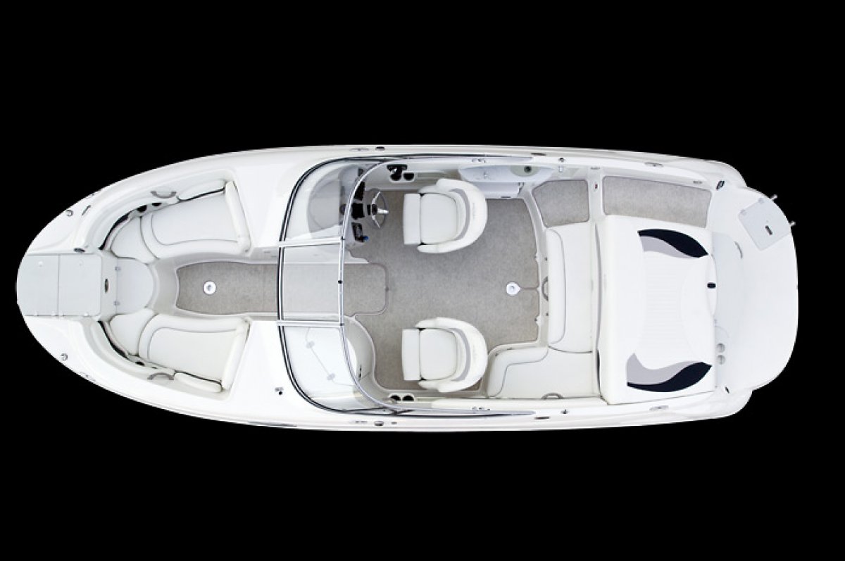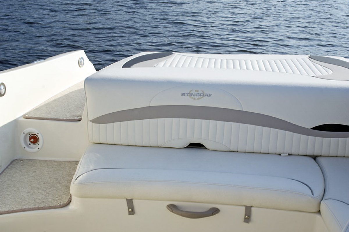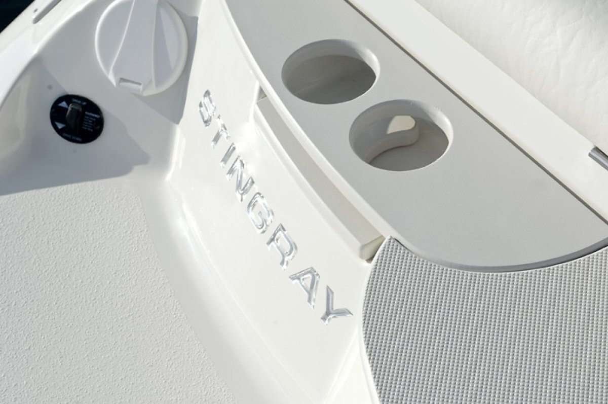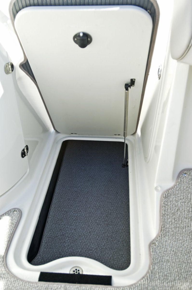 A view of this 2311 boat from an overhead perspective verifies its easy come, easy go entry and exit beginning at the transom. With a 38cm wide starboard-side companionway and cockpit step, not only is passenger boarding a breeze but accessing the integrated extended platform for water sports activities is convenient, safe and hassle-free. The swim platform is oversized and includes built-in drink holders, a fiberglass storage compartment with non-skid lid, a two-inch fuel fill, a transom mount trim/tilt switch, transom shower and optional stereo remote.