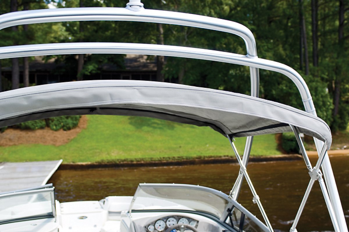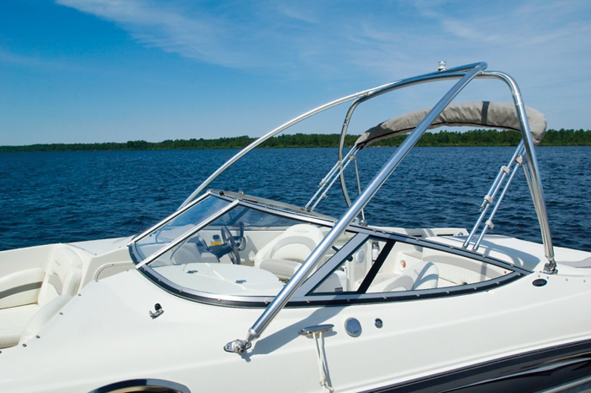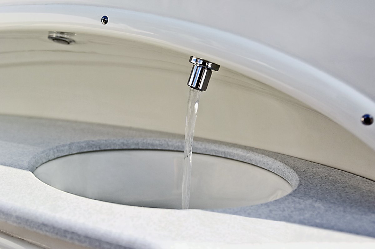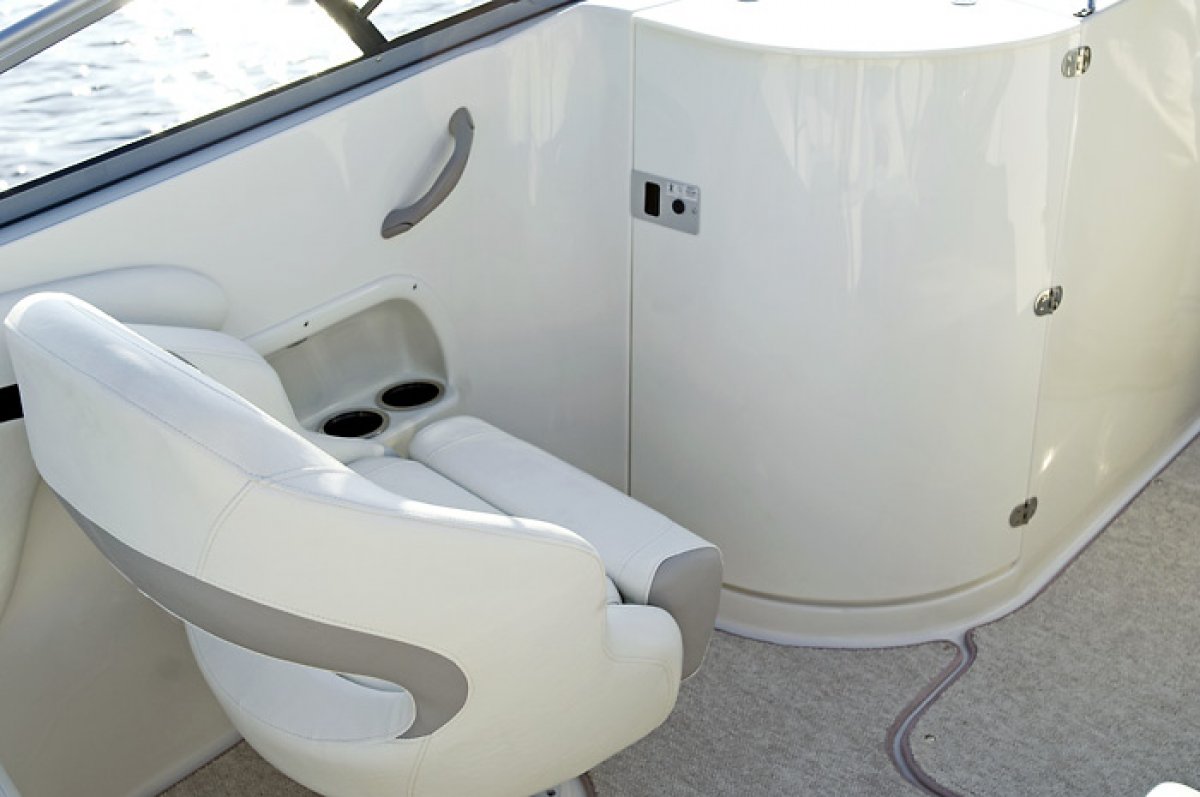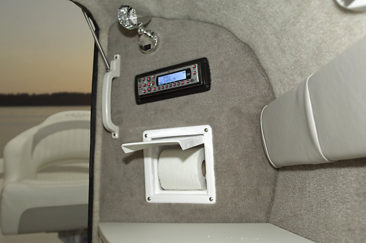 A view of this 2311 boat from an overhead perspective verifies its easy come, easy go entry and exit beginning at the transom. With a 38cm wide starboard-side companionway and cockpit step, not only is passenger boarding a breeze but accessing the integrated extended platform for water sports activities is convenient, safe and hassle-free. The swim platform is oversized and includes built-in drink holders, a fiberglass storage compartment with non-skid lid, a two-inch fuel fill, a transom mount trim/tilt switch, transom shower and optional stereo remote.