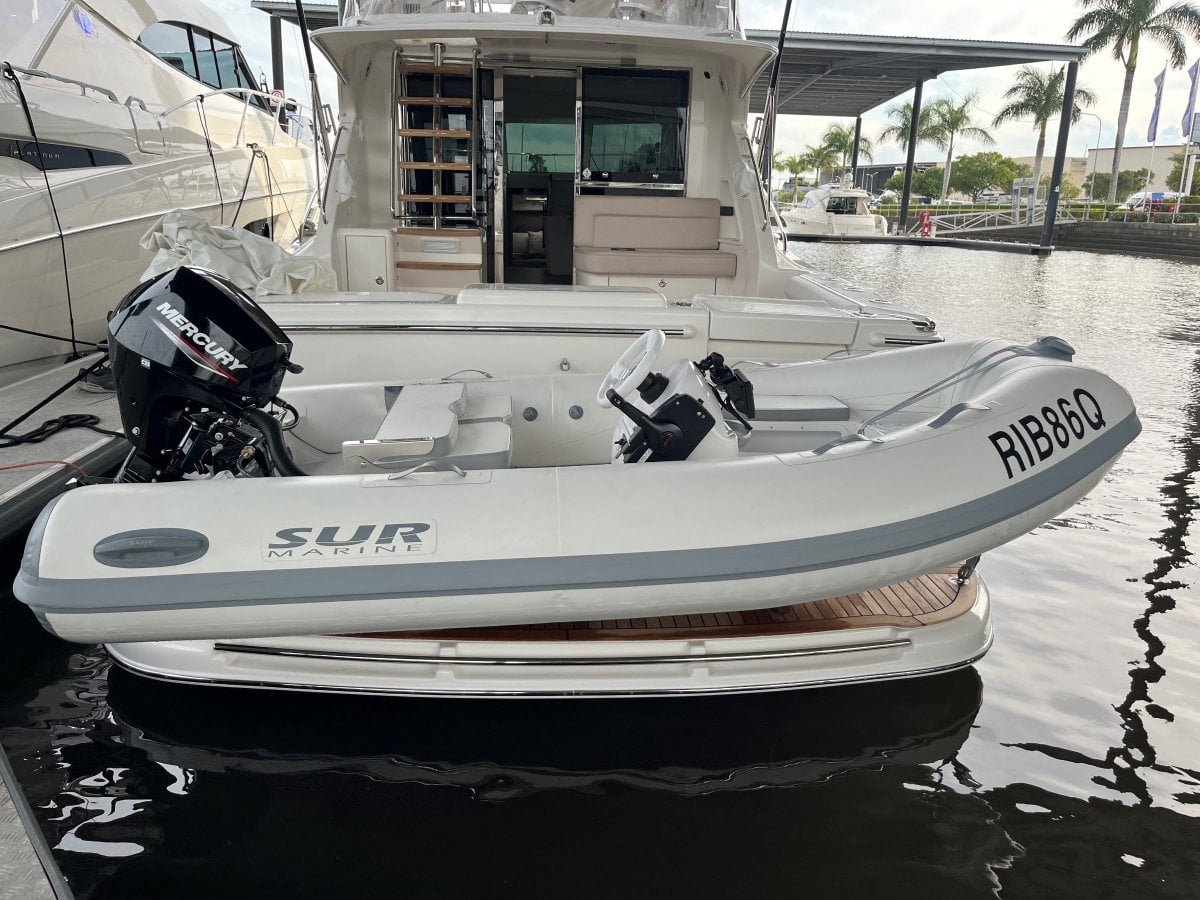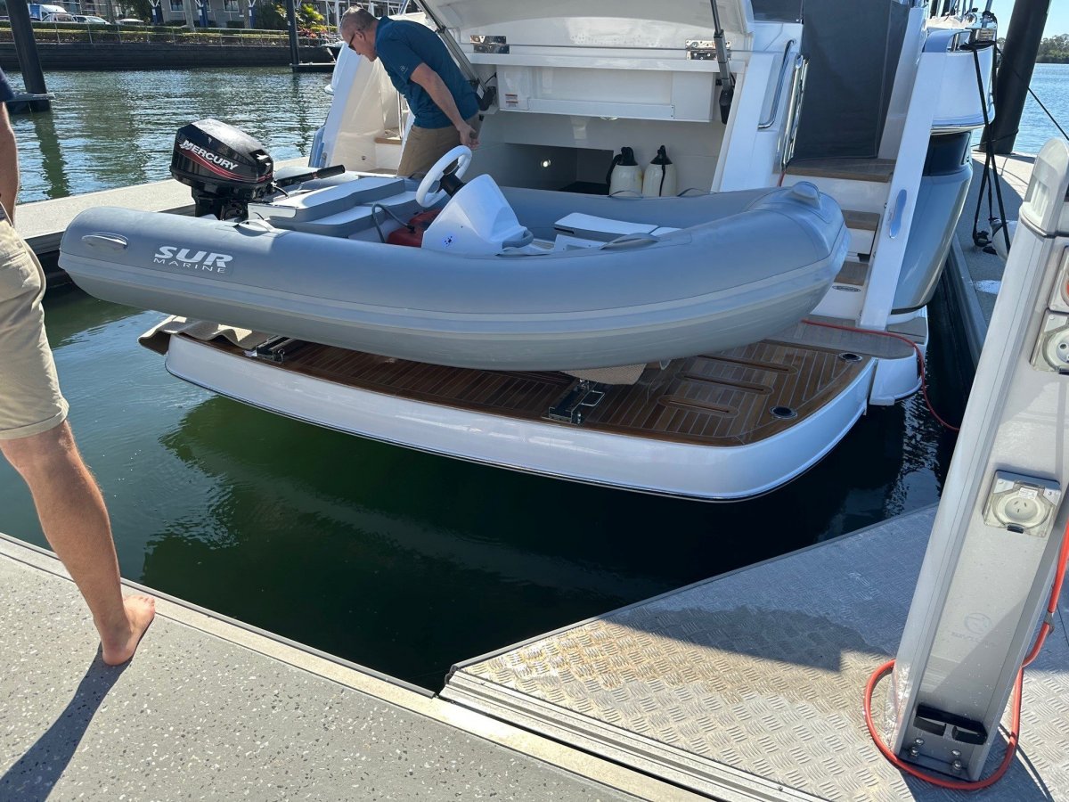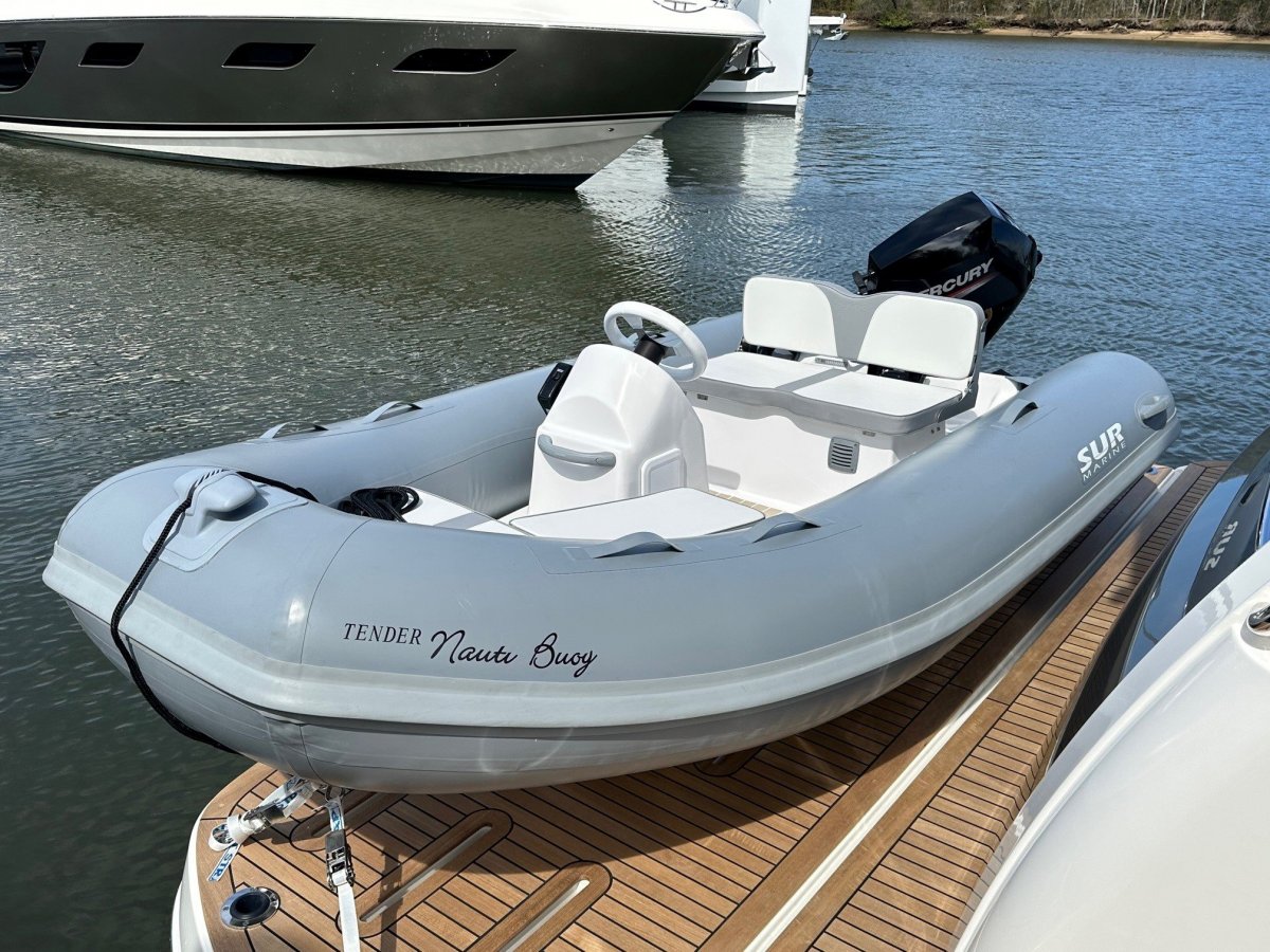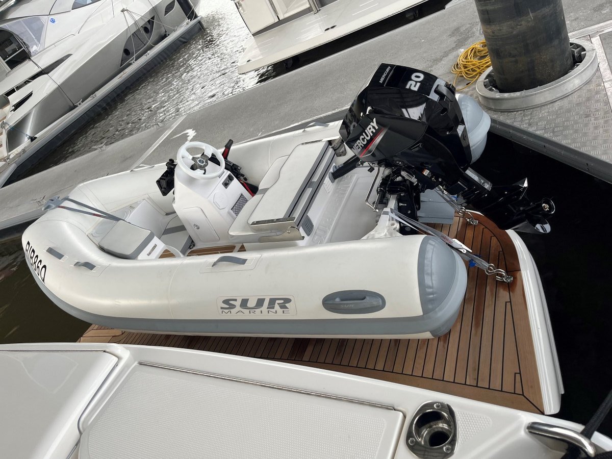 The SUR range of SUPER TENDERS are designed to be the perfect choice as tender for premium luxury vessels. The stylish Italian looks coupled with the comfort of the seating arrangement, together with the efficient performance (planning at 12 knots) make the SUR the right choice. The hull of the SUR is extended and provides a larger planning strake than other RIBs in its class. The SUR range of SUPER Tenders is the lightest tenders in its class - even lighter than aluminium. The SUR is able to perform well with low horsepower. These two factors makes the SUR exceptionally light which makes the SUR suitable for hydraulic swim platforms and davit lifts with weight constraints. The low profile of the SUR fits many garages on premium yachts. The boarding step and bow arrangement seating is practical and stylish.