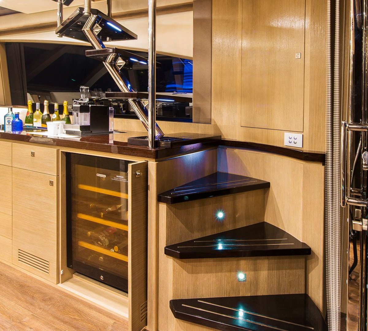 Air conditioning 12,000 BTU with reverse cycle, Carpet with underlay, Hanging locker cedar lined with auto lighting DC, Portside guests twin single beds/convert to double, Porthole opening stainless steel, Miele Washer/Dryer in Companionway
