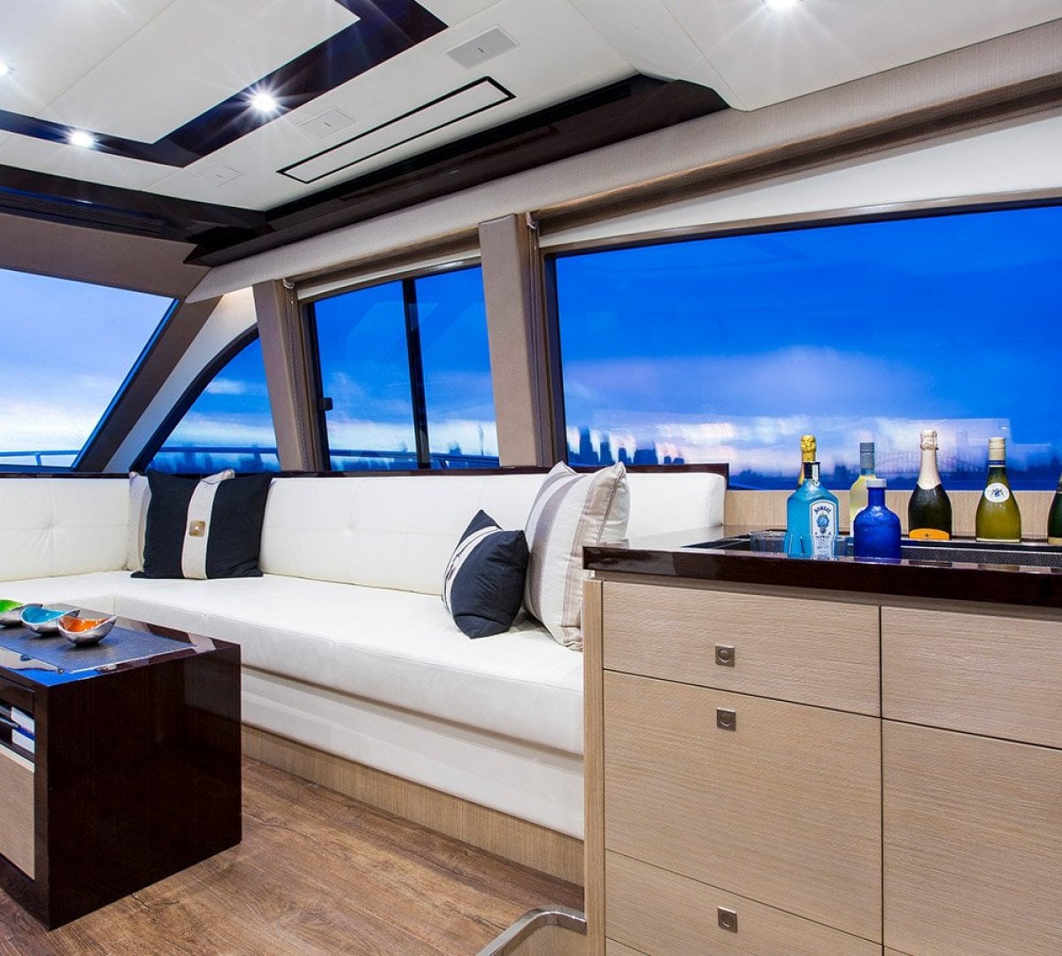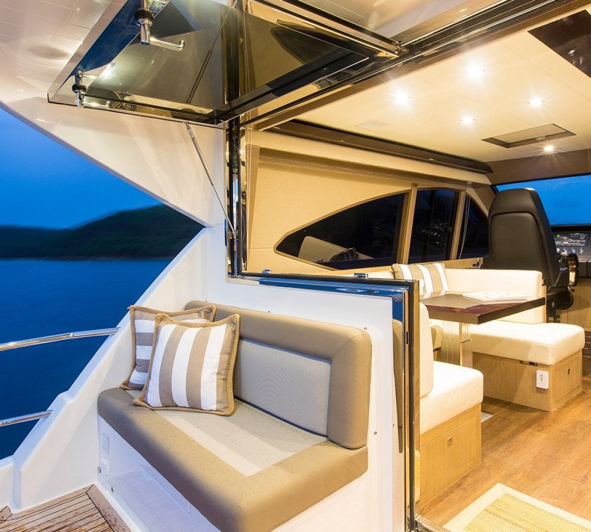 Some of the special highlights include a large swim platform and tender garage, covered cockpit with electric awning for alfresco dining, ultra-spacious saloon that features a full-size dining table for seating eight in complete comfort, a full-beam Master cabin with adjacent ensuite that optimises the feeling of space using 'switch glass' panelling that's clear when not in use and opaque when in use.