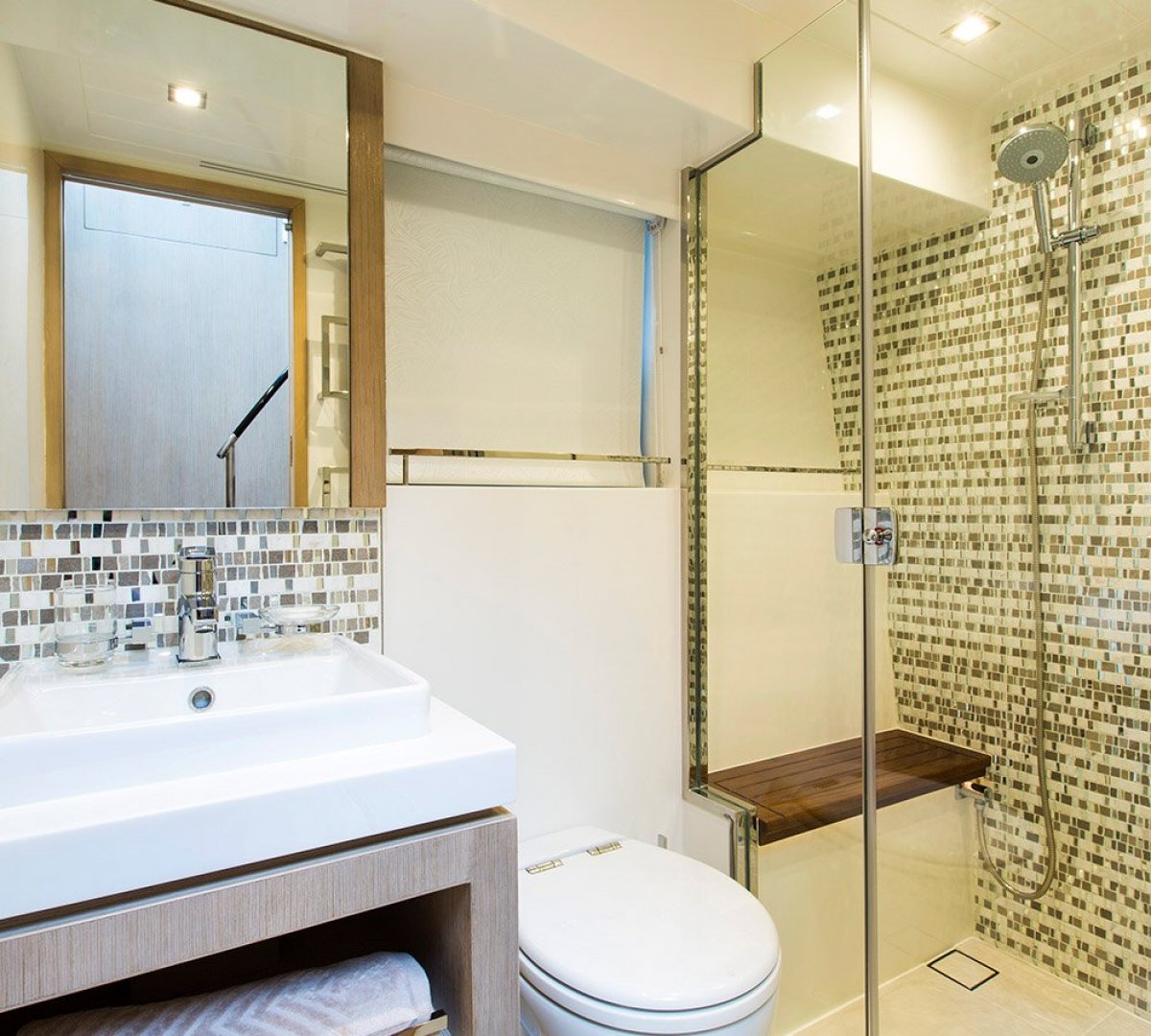 Lounge seating stbd side, Private door entrance with full length mirror behind, Private ensuite, Robe hanging rail, drawers, auto lighting DC