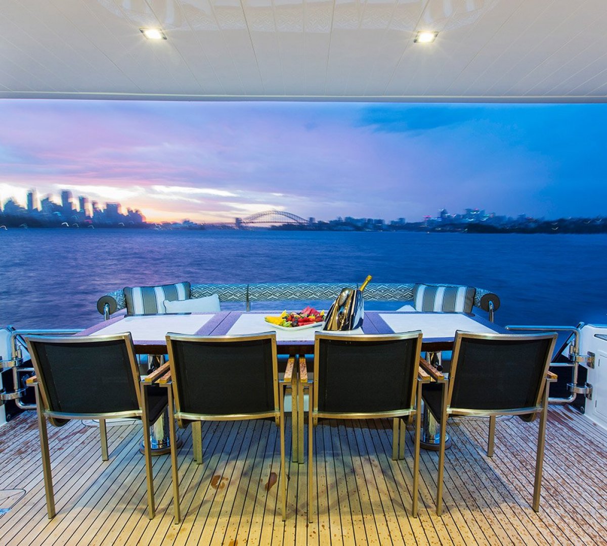 The Flybridge is yet another gracious living space, with a three helm chair arrangement and luxurious outdoor lounge for socialising with one and all.