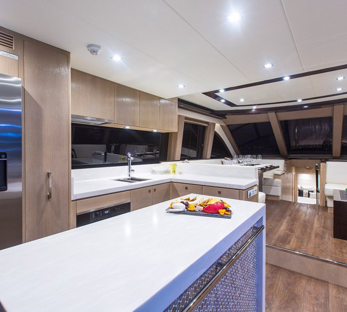 Convection Oven/Microwave, Induction 4 burner cooktop, Exhaust fan, Overhead storage lockers, Double Power Points to run from inverter, Single lever mixer tap to galley sink, Solid surface benchtop, Storage cabinets & draws below bench, Water purifier, Garbage bin, Dishwasher drawer, Amtico or equivalent flooring.