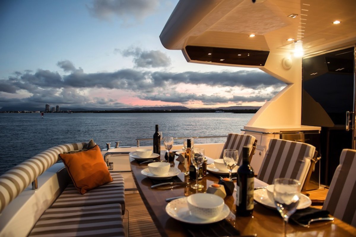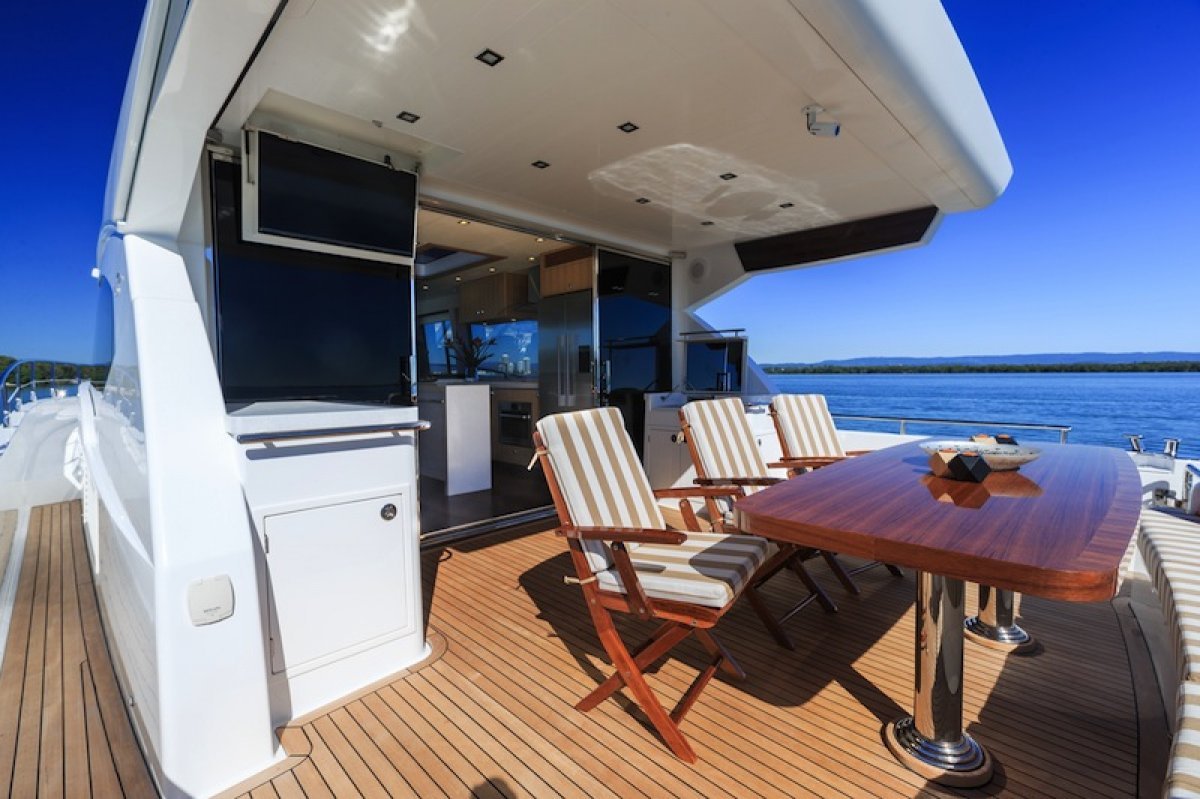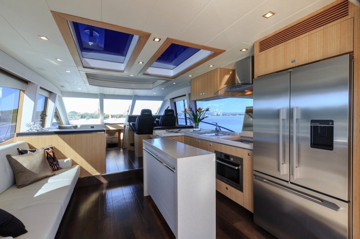 Spacious aft galley with central island bench and all modern appliances including a four burner cooktop, Bosch microwave and dishwasher draw.
