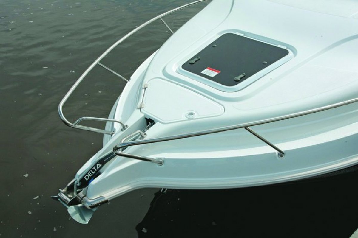 Smart and sleek, the CR 2380 is a trend-setting compact sports cruiser that turns corners and heads. Retaining classic Whittley hallmarks, like the solid curved sliding cabin door that opens into a large V-berth cabin, the CR 2380 is built on a seagoing platform that is rugged and resilient. The variable deadrise hull provides a smooth, dry ride and affords ample storage options. A further large storage compartment runs down the starboard side of the cockpit and forms an L-shaped lounge, which converts into a double bed and uses the dinette table as an infill. The optional moulded Targa bar acts as mounting point for antennae, navigation lamps and full covers and clears. A curved and tinted glass windscreen is enhanced with a standard-issue wiper, and the spacious and well laid out helm features tilt-adjustable steering, space for sounder and moulded cup holders. An adjustable bucket seat and a clever galley with cold and optional hot water, removable portable stove and fridge complete the appointments. The roomy cockpit flows to a moulded transom step-through, providing easy access to the boarding platform, which also acts a balcony and fishing platform.