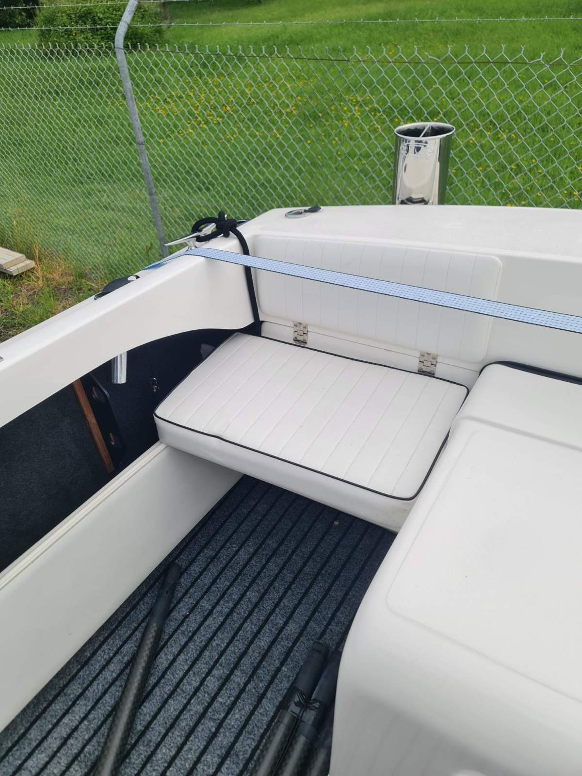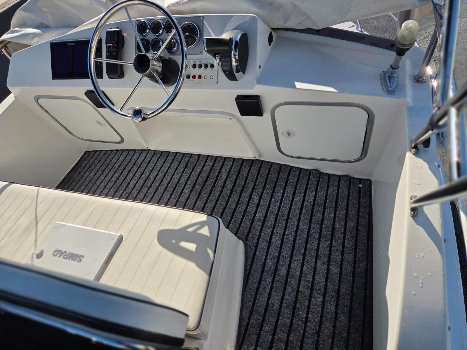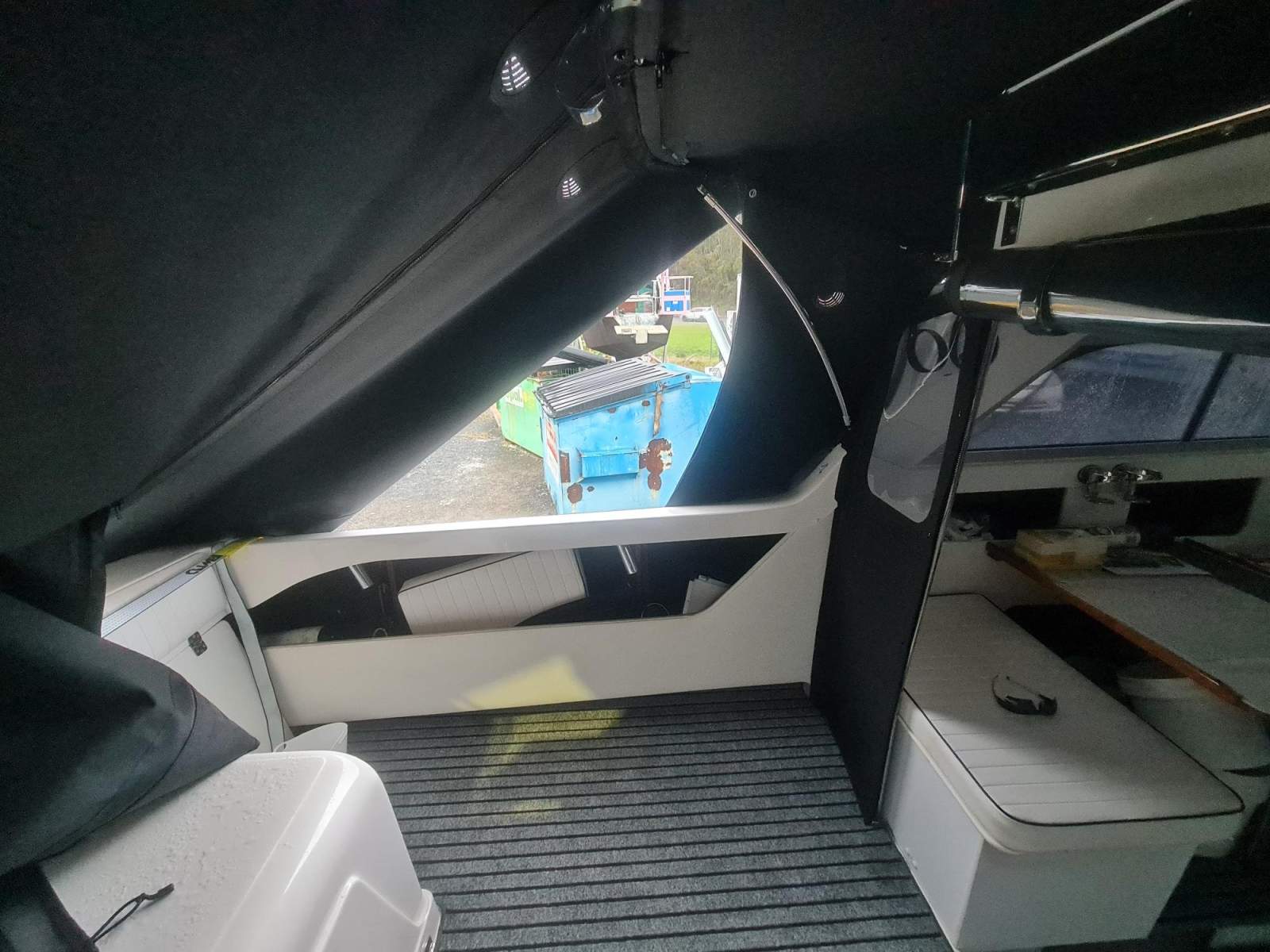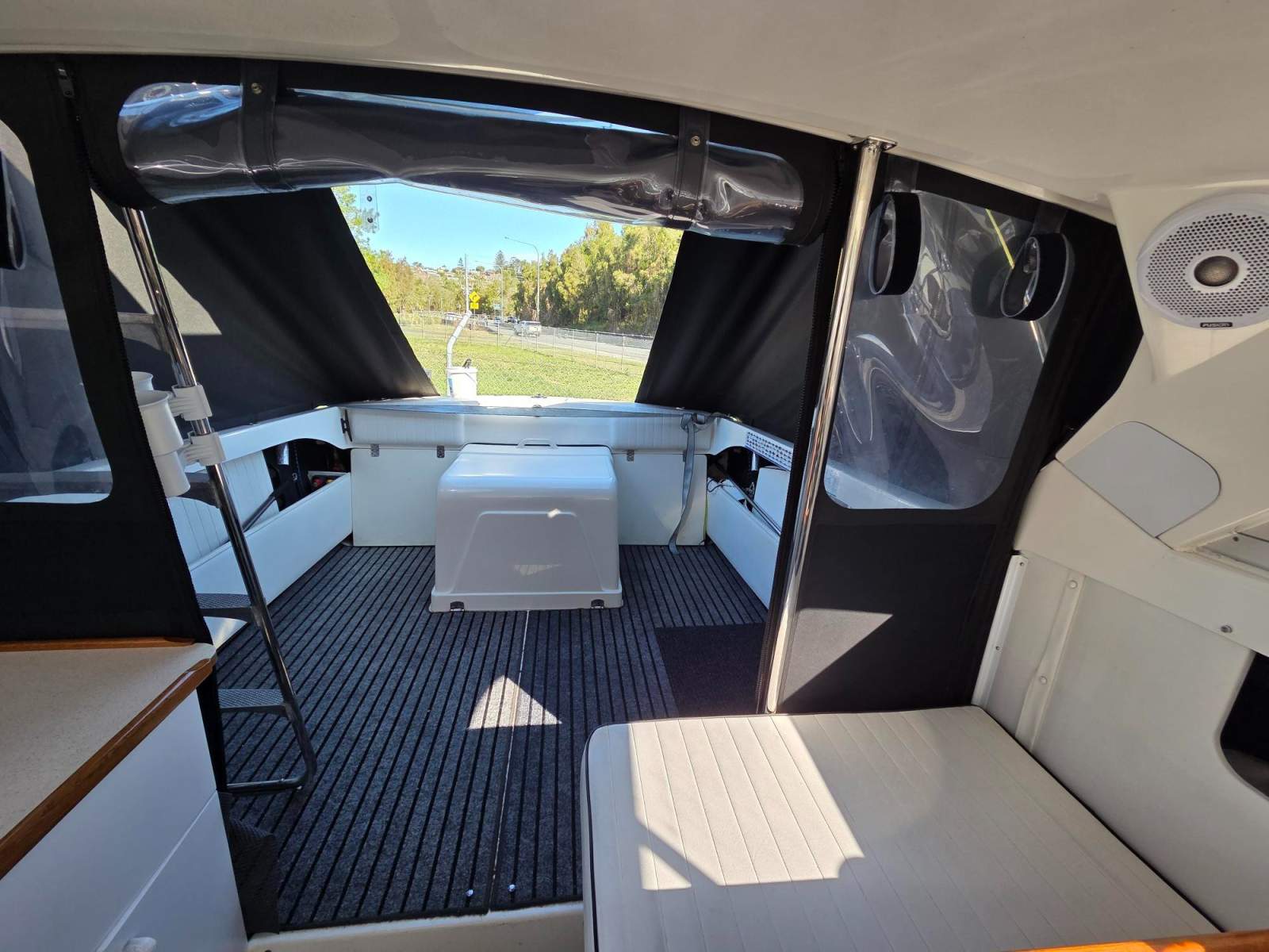 New canopy system and stainless rail system designed and installed 2024, to create a shade area in cockpit and allow comfortable seating forward and aft at rear table and moving the old stainless pole, in a poor position. And make the system much more water proof. New rocket launchers moved to aft to position for new canopy and new hand rail underneath to stand while underway. Provide for new drop and side curtains to enable a full waterproof approach on trailer or on a berth and allow fishing in the rain. Black mesh screens clip on for windows. New upholstery to Flybridge cushion. Cost $12K.
