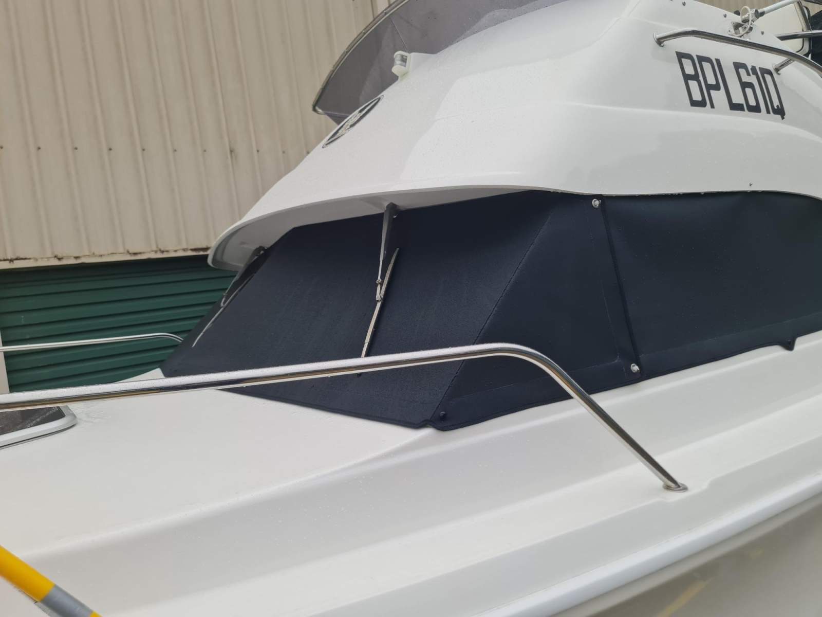 SS flybridge canopy frame and canvas, and small flybridge helm cover.