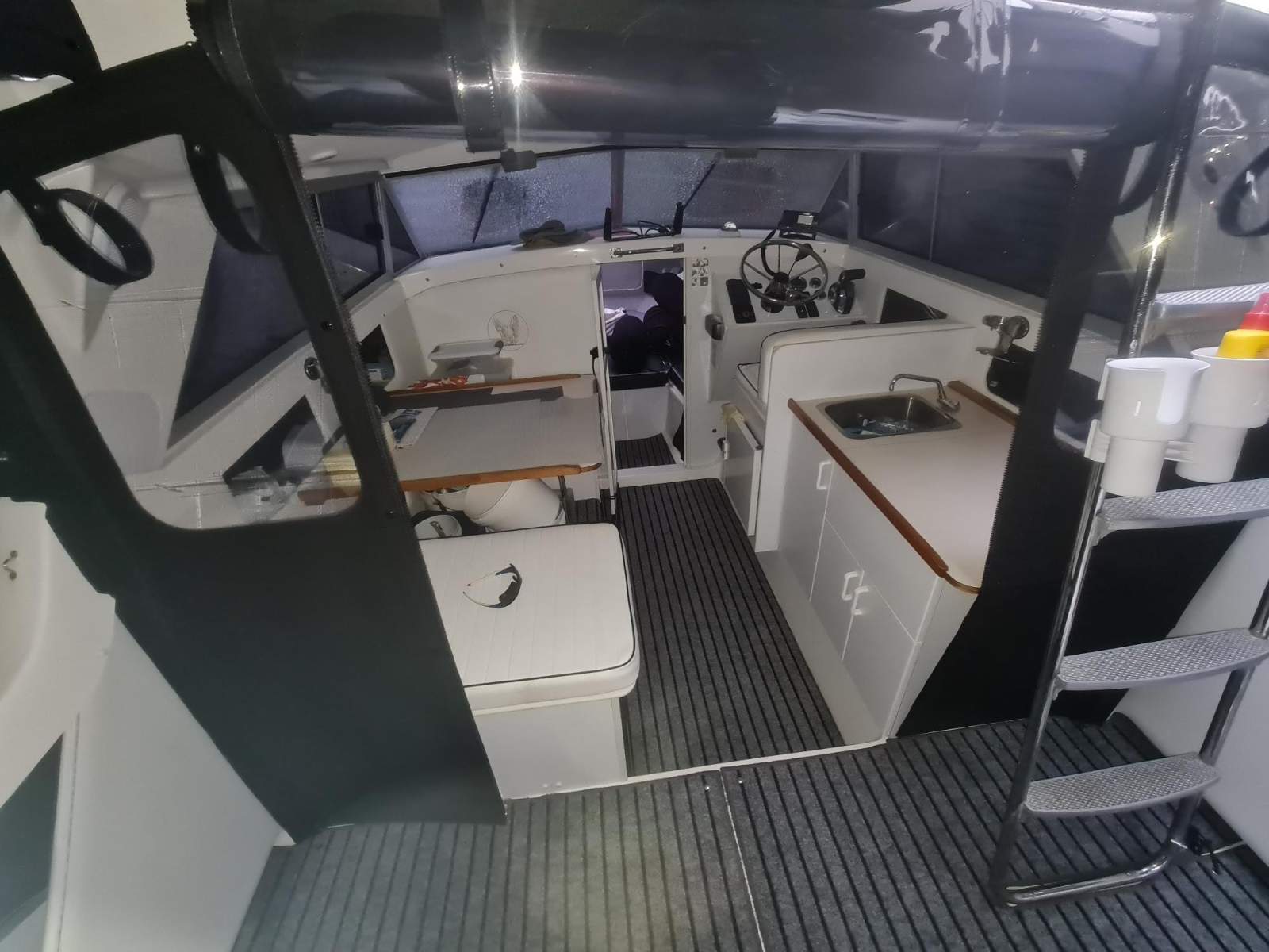 Stainless helm steering option fitted downstairs and to flybridge.