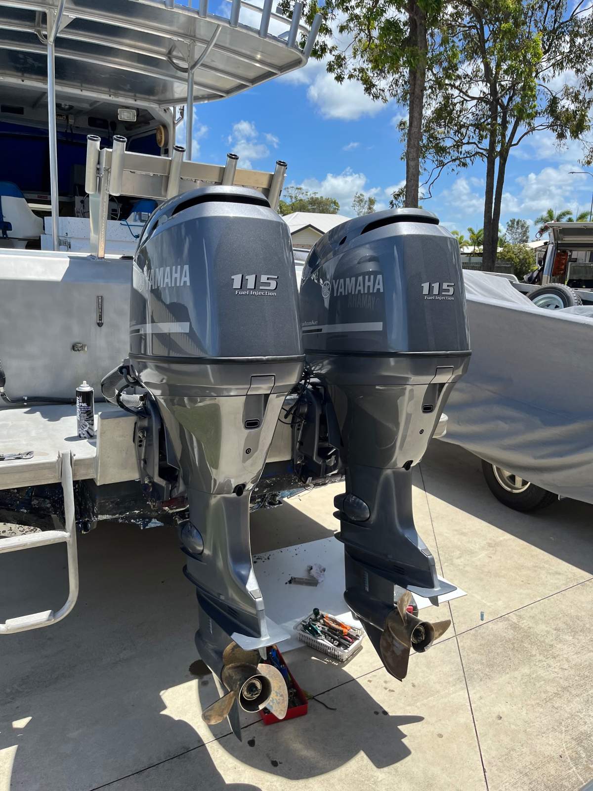 2x 2012 Yamaha 115 hp 4 stroke outboard motors, 1000 hrs, stainless props, 25" shaft, run well. Control boxes and cables, Will separate, counter rotating $7200. STD rotation $8200 or both $15000. Available to test drive until new motors arrive