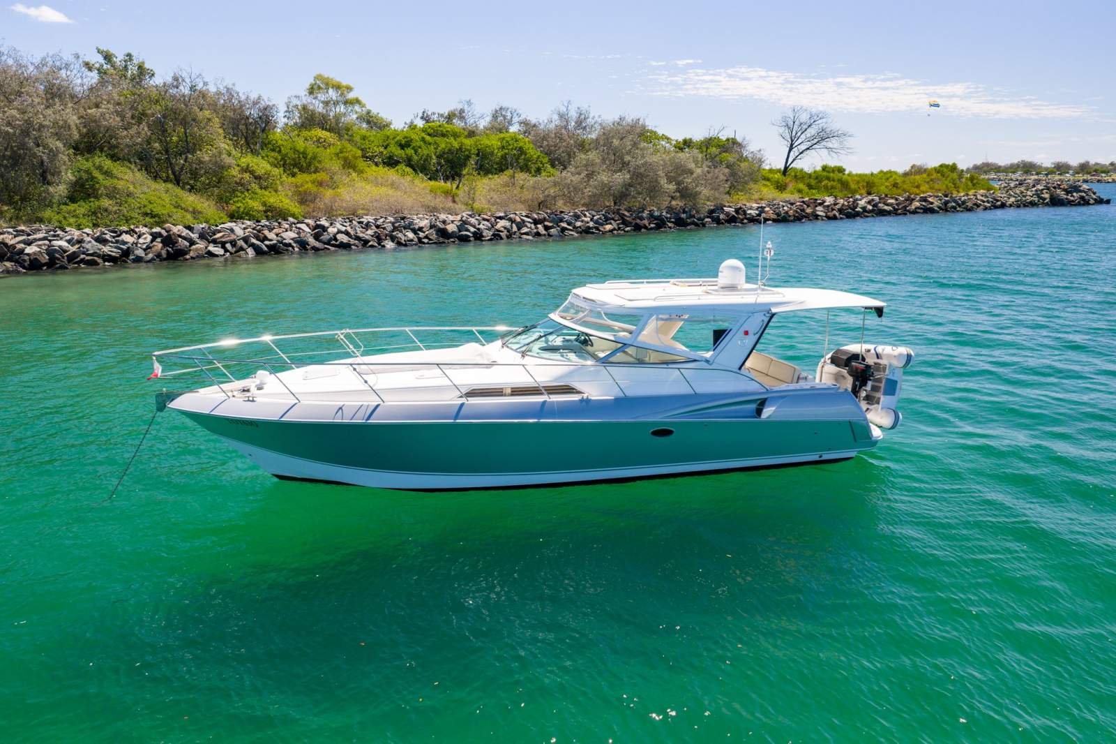 Wide side decks, secure boarding access and generous cockpit space make her equally suited to entertaining at anchor or coastal cruising. The metallic silver hull sets her apart immediately - visually commanding, unmistakable and highly distinctive on the Gold Coast waterways.