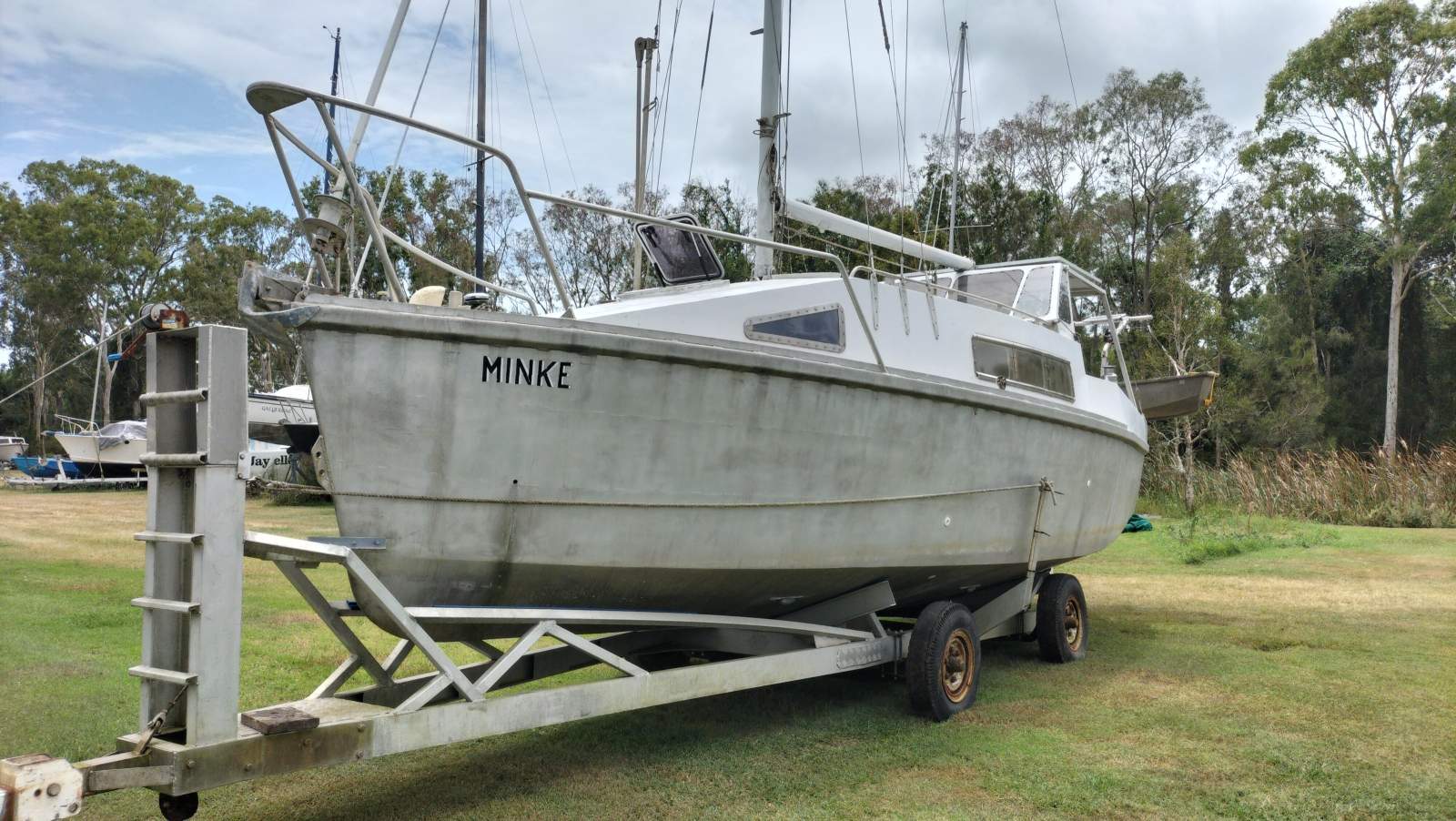 Large Dual zone fridge freezer Primus 130 litre. Well laid out galley with lots of storage. Full solid aluminium cockpit protection, Magma gas BBQ. 2 X Auto bilge pumps, 1x manual bilge pump, aluminium dinghy on davits. Approx 1' 11" (600 ) draft with centre board up and 5' 6" (1700 ) keel down allows access to protected waters like multihulls. Fully protected Prop with Skeg, Transom hung rudder. New Anodes and Tru design skin fittings, aluminium sugar scoop and duck board allows easy boarding. Aluminium launch trailer, yacht sold with or without trailer ( price adjustment without). Minke is a very roomy fully insulated functional vessel and comfortable sea boat. Lots of storage, all lines lead to the cockpit. The only reason to go fwd is for anchor raising and lowering and spinnaker work. She has a Floppa Stoppa stabiliser ( I have never used it ) Easily sailed single handed, comfortable couple boat. Never been antifouled or any bottom paint ( very easy for below water line inspection). When built it was designed that it can legally be transported on a road registered trailer if required.