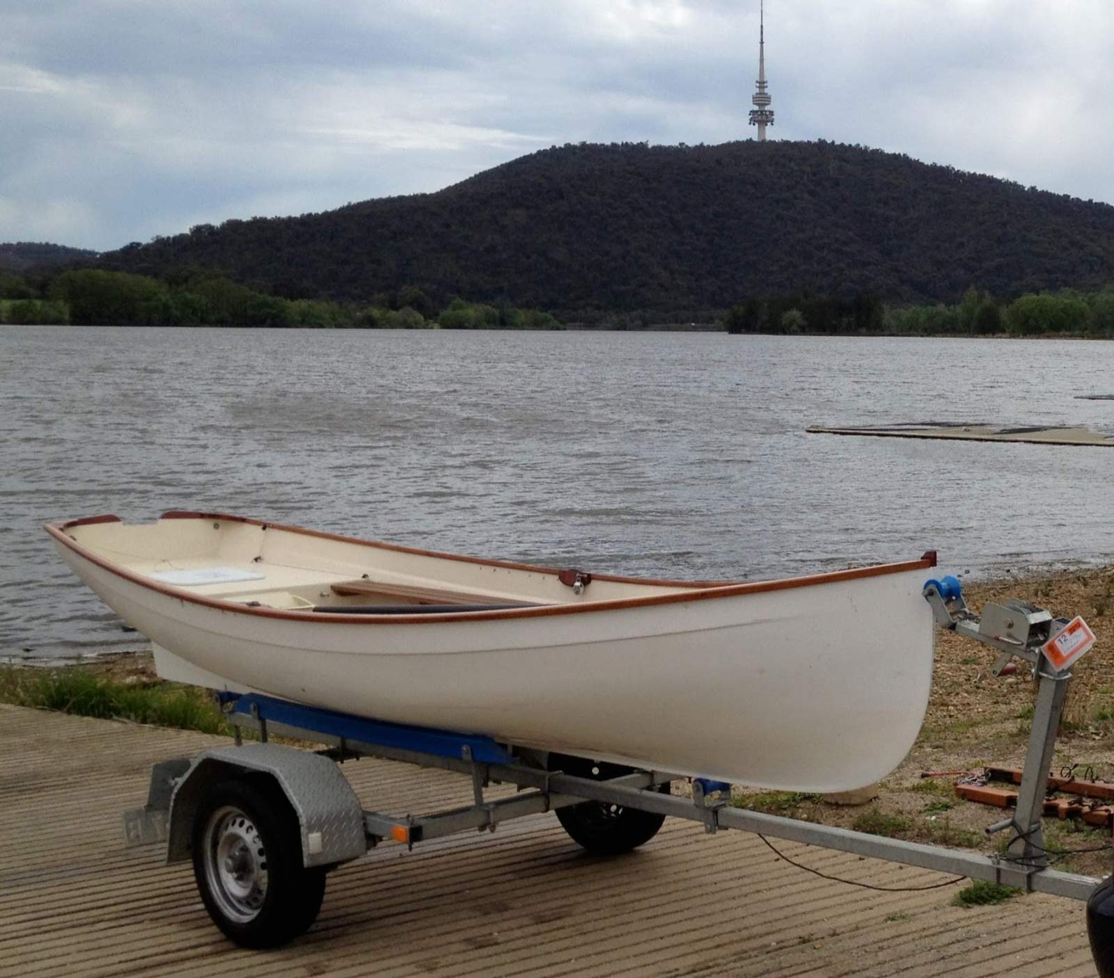 A custom-built Whitehall dinghy on trailer. Fitted with sliding seat and outrigger rowlocks for sculling, or alternately normal rowing or sailing with a Mirror rig, a finely built and easily sriven craft that runs true and easily. Great for sculling training or learing or just enjoying the water.