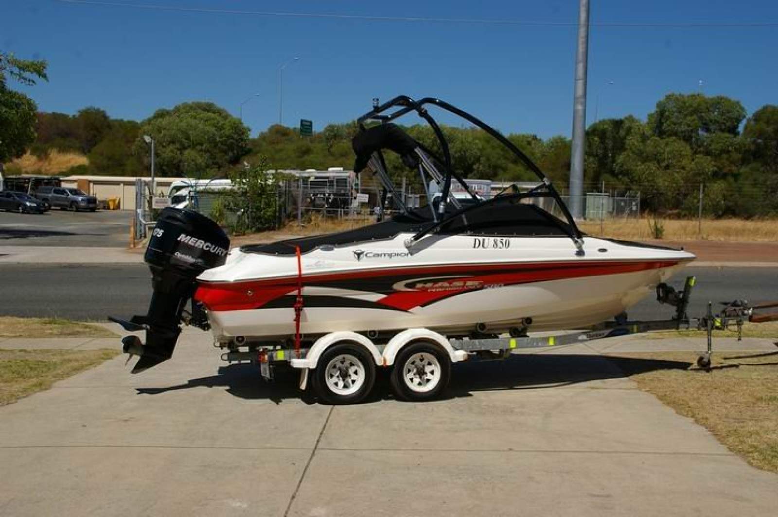 Mostly used around the Southern dams this boat has a powder coated wake tower with rear mirror. Perfect for those that take their wake boarding seriously. Excellent shade from a collapsible canopy, plus bow cover and cockpit travel covers. Loads of storage under all this seats and a huge under floor storage area for skis or wake boards.