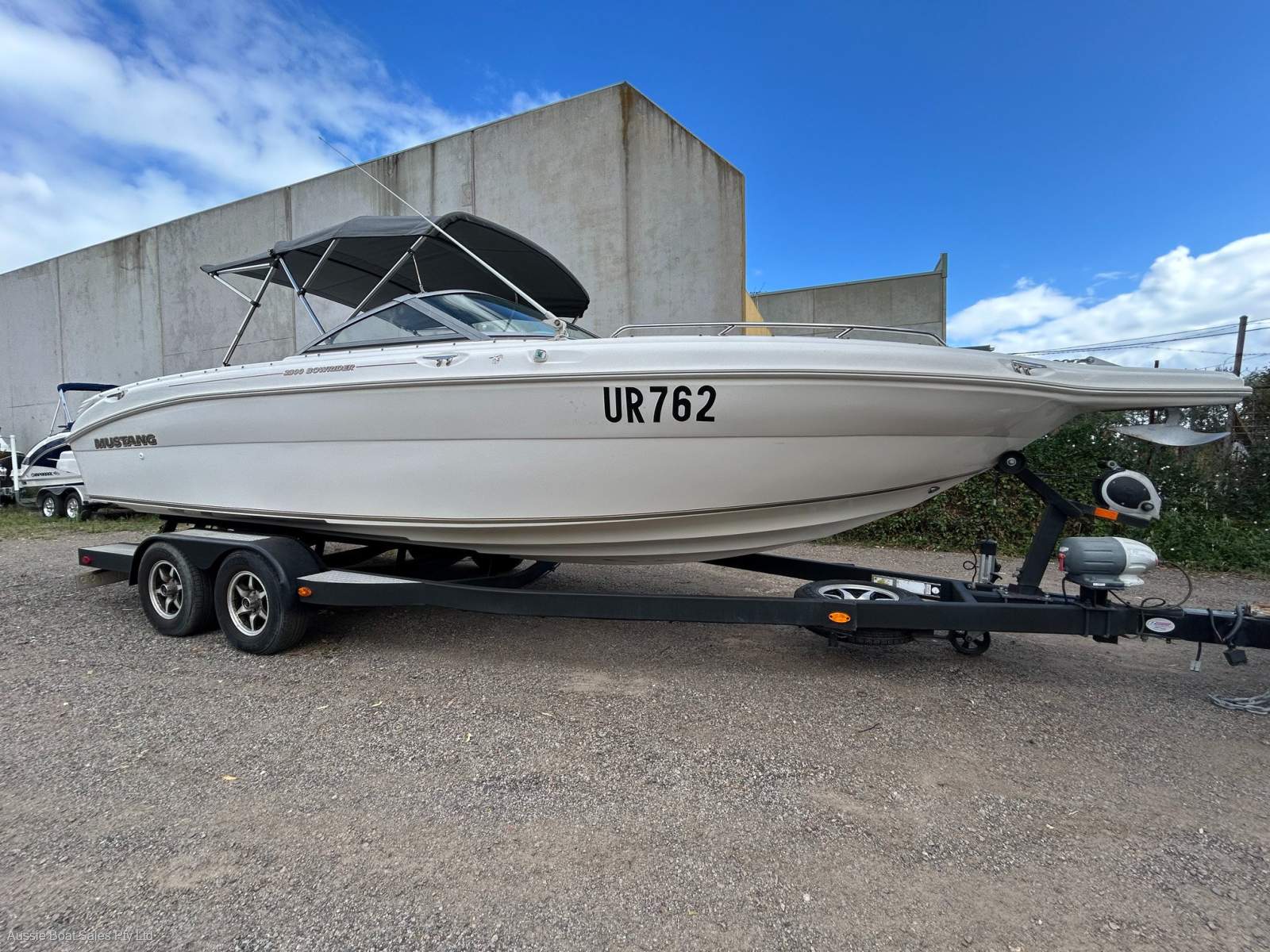Mustang 2300 Bowrider, 2001 Model, Mercruiser 350 Mag V8 - 300 HP, Bravo 2 stern drive, tandem trailer with Alko braking system and mags. These Mustang bowriders are hard to find, but they are an awesome boat. Built on the 2200 sports cruiser hull, they run a deep V hull that soaks up rough water with ease and have high freeboard for a safe, dry ride. The big volume cockpit is spacious with plenty of seating, has stacks of storage and is packed with features. Performance with the 300HP V8 is impressive as well, jumping on the plane quickly and reaching nearly 100kph top speed without any fuss - stable and well behaved.